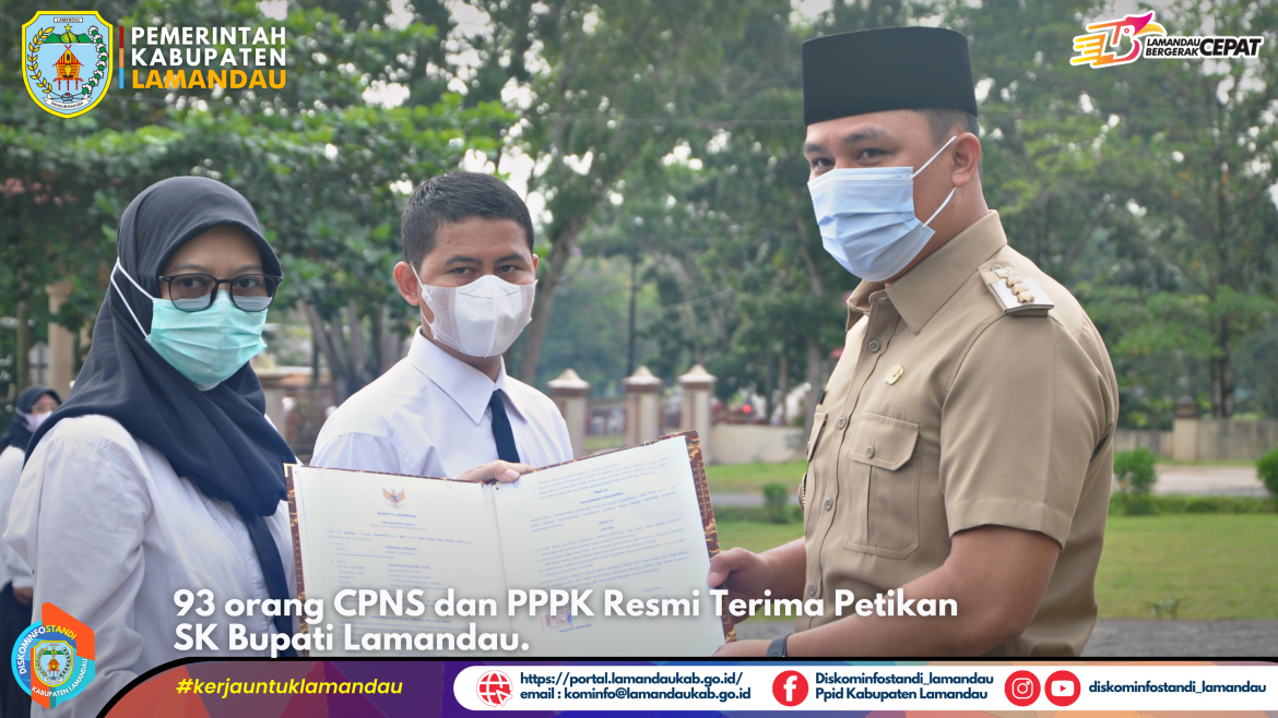Lamandau Bergerak Cepat (LBC) – Bupati Lamandau Hendra Lesmana serahkan Keputusan Pengangkatan Calon Pegawai Negeri Sipil dan Pegawai Pemerintah dengan Perjanjian Kerja (PPPK) di Lingkungan Pemerintah Kabupaten Lamandau Formasi Tahun 2021 di halaman kantor BKPSDM Kabupaten Lamandau, Senin (10/5).