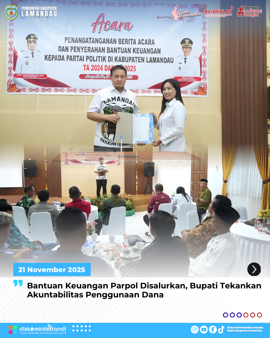Nanga Bulik – Bupati Lamandau, Rizky Aditya Putra, menghadiri Penandatanganan Berita Acara Serah Terima Bantuan Keuangan kepada Partai Politik Tahun Anggaran 2024 dan 2025, Jumat (21/11/2025) di Aula Kantor Kesbangpol Lamandau.
