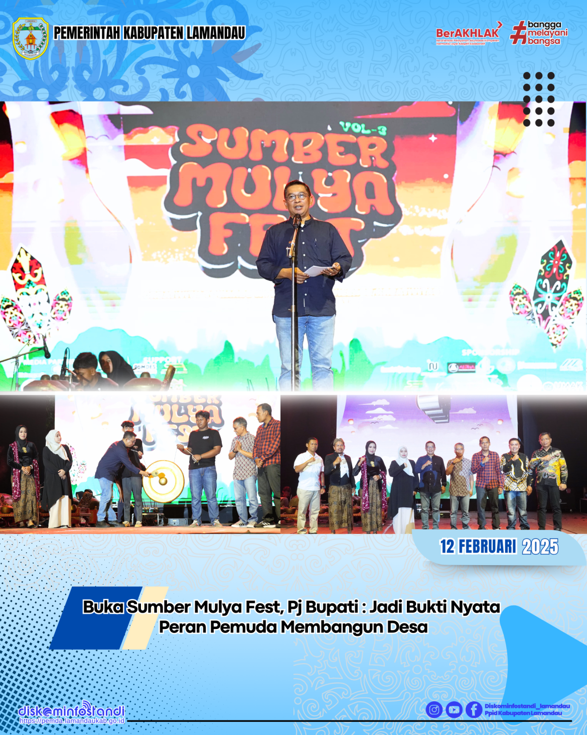 “Dengan sekitar 500 KK dan 1600-an jiwa, Desa Sumber Mulya masuk kategori Desa mandiri dan mudah-mudahan dengan ini juga berdampak positif kepada masyarakat dengan peningkatan kesejahteraan di masyarakat dan tentu saja yang lebih lagi bahwa dengan acara ini adalah sebagai wadah bagi masyarakat Desa Sumber Mulya bukan hanya pemuda tetapi juga bapak-bapak, ibu-ibu yang sudah dewasa untuk bisa mengapresiasikan berinovasi di Sumber Mulya Festival”, pungkasnya. (Diskominfostandi)