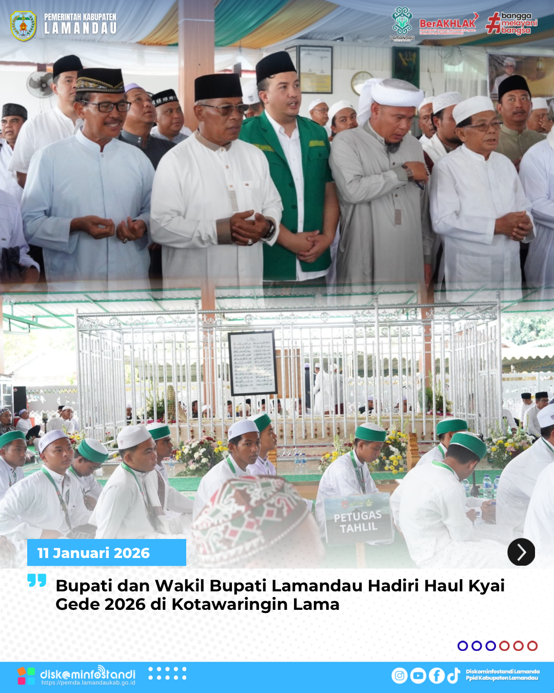 Kotawaringin Lama – Bupati Lamandau, Rizky Aditya Putra, bersama Wakil Bupati Lamandau, Abdul Hamid, menghadiri peringatan Haul Kyai Gede Tahun 2026 yang digelar di Kotawaringin Lama, Kabupaten Kotawaringin Barat, Minggu (11/1). Kegiatan tersebut berlangsung khidmat dan diikuti ratusan jemaah dari berbagai daerah.