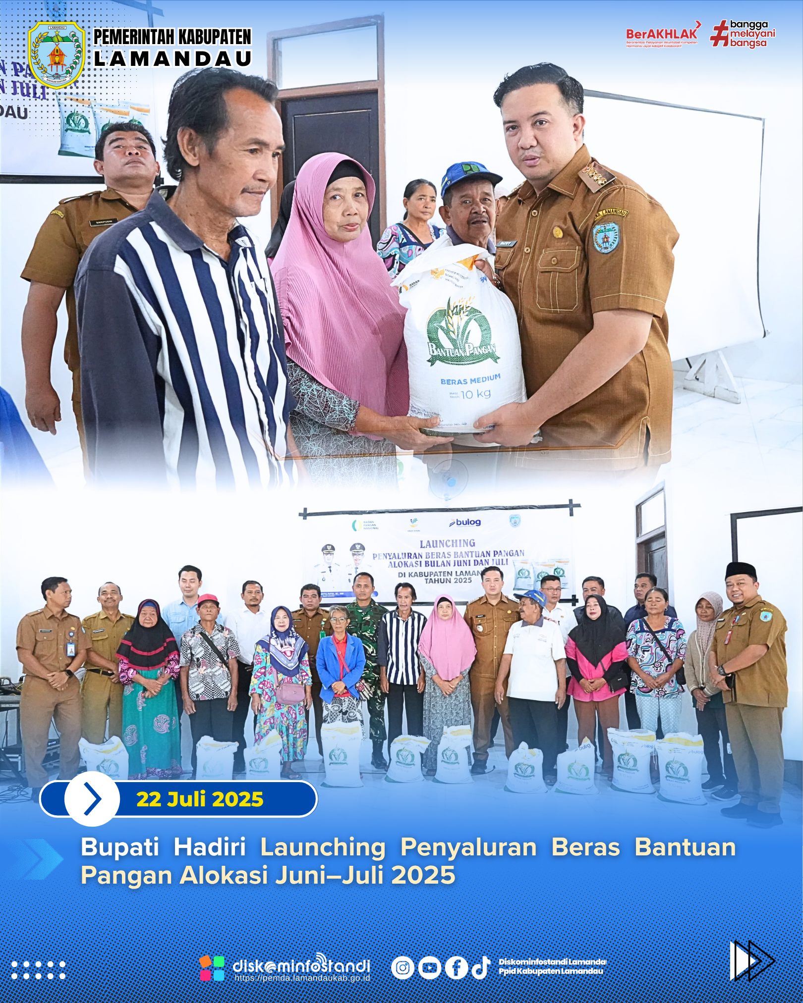 Bupati Lamandau, Rizky Aditya Putra, secara langsung menghadiri kegiatan launching penyaluran bantuan pangan untuk alokasi bulan Juni dan Juli 2025 yang digelar di Kantor Kelurahan Nanga Bulik, pada Selasa (22/7/2025).