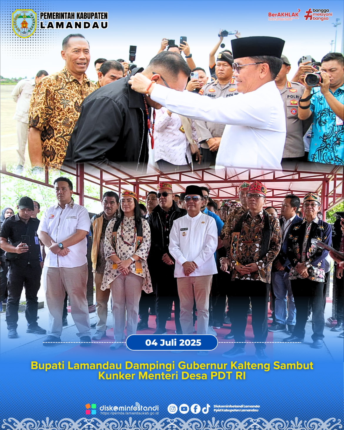Palangka Raya – Bupati Lamandau Rizki Aditya Putra dampingi Gubernur Kalteng Agustiar Sabran, sambut kedatangan kunjungan kerja Menteri Desa Pembangunan Daerah Tertinggal (PDT) RI dan Ketua Umum Tidar Pusat sekaligus Wakil Ketua Komisi VII DPR RI, Rahayu Saraswati Djojohadikusumo, serta Wakil Menteri Investasi dan Hilirisasi RI, dan Wakil Menteri Pendidikan Tinggi, Sains, Teknologi RI beserta Rombongan, Jumat (4/7/25).