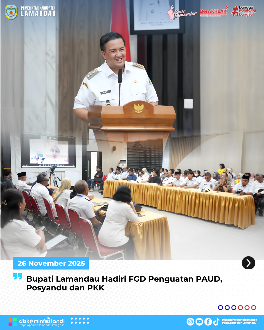 Nanga Bulik – Bupati Lamandau, Rizky Aditya Putra, menghadiri Focus Group Discussion (FGD) Penguatan Pendidikan Anak Usia Dini (PAUD), Pos Pelayanan Terpadu (Posyandu), dan Pemberdayaan dan Kesejahteraan Keluarga (PKK) yang digelar Pemkab Lamandau bekerja sama dengan Universitas Gadjah Mada (UGM), Rabu (26/11/2025), di Aula Setda Lamandau.