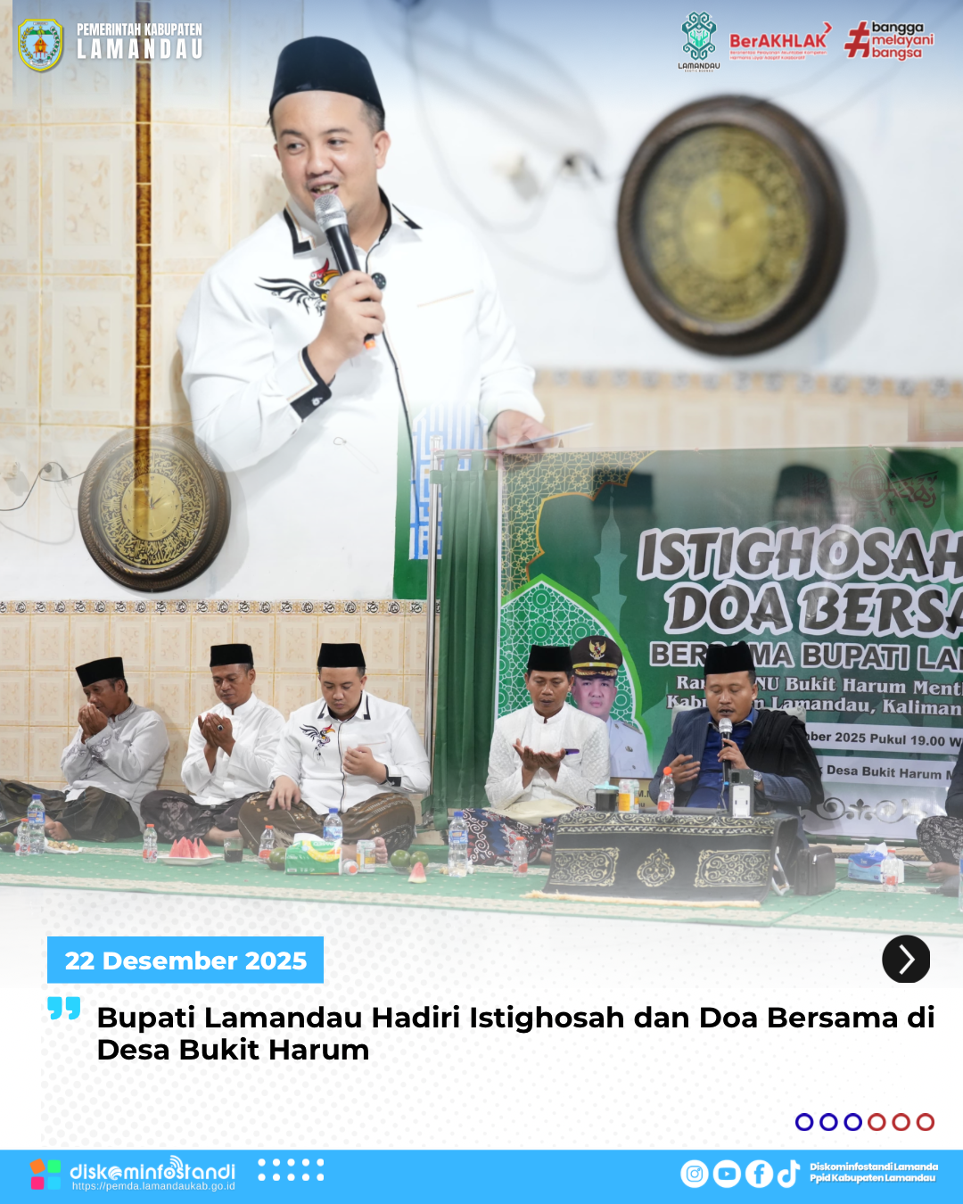 Nanga Bulik – Bupati Lamandau, Rizky Aditya Putra, menghadiri kegiatan Istighosah dan Doa Bersama yang diselenggarakan oleh Ranting Nahdlatul Ulama (NU) Desa Bukit Harum bersama jamaah dan tokoh masyarakat setempat sebagai bentuk ikhtiar batin sekaligus penguatan spiritual umat, di Masjid Al Mubarok, Senin (22/12).