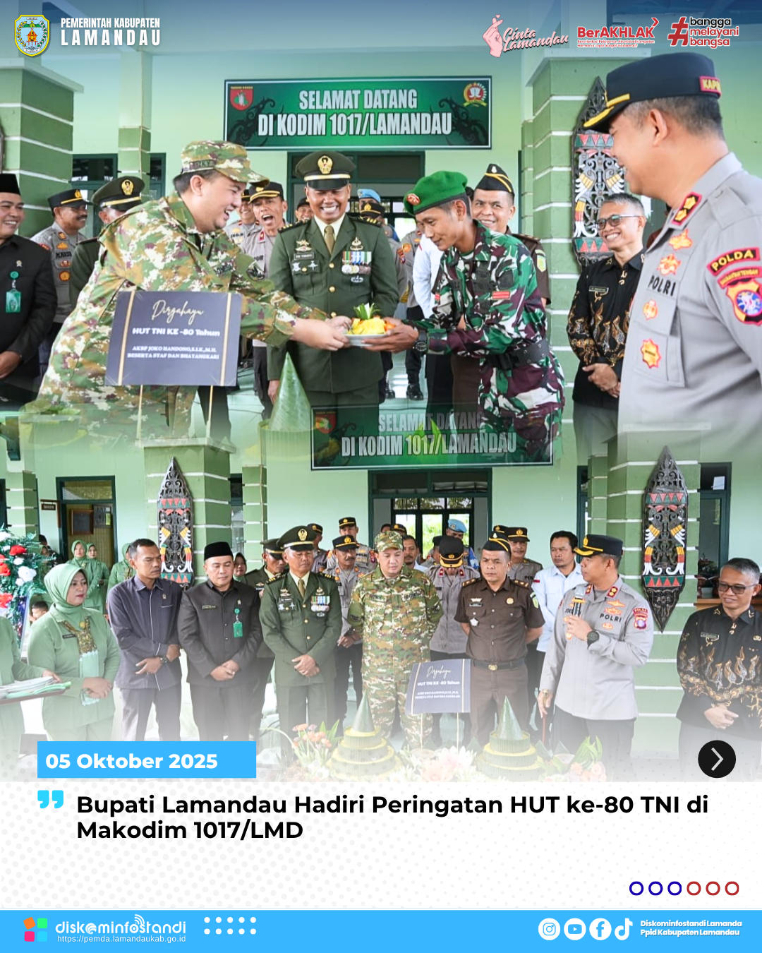 “Atas nama Pemerintah Kabupaten Lamandau, kami mengucapkan selamat HUT ke-80 kepada seluruh jajaran TNI. Semoga TNI terus jaya dan menjadi garda terdepan dalam menjaga kedaulatan negara, sekaligus mitra pemerintah daerah dalam membangun Lamandau yang aman dan maju,” ujar Bupati Rizky.