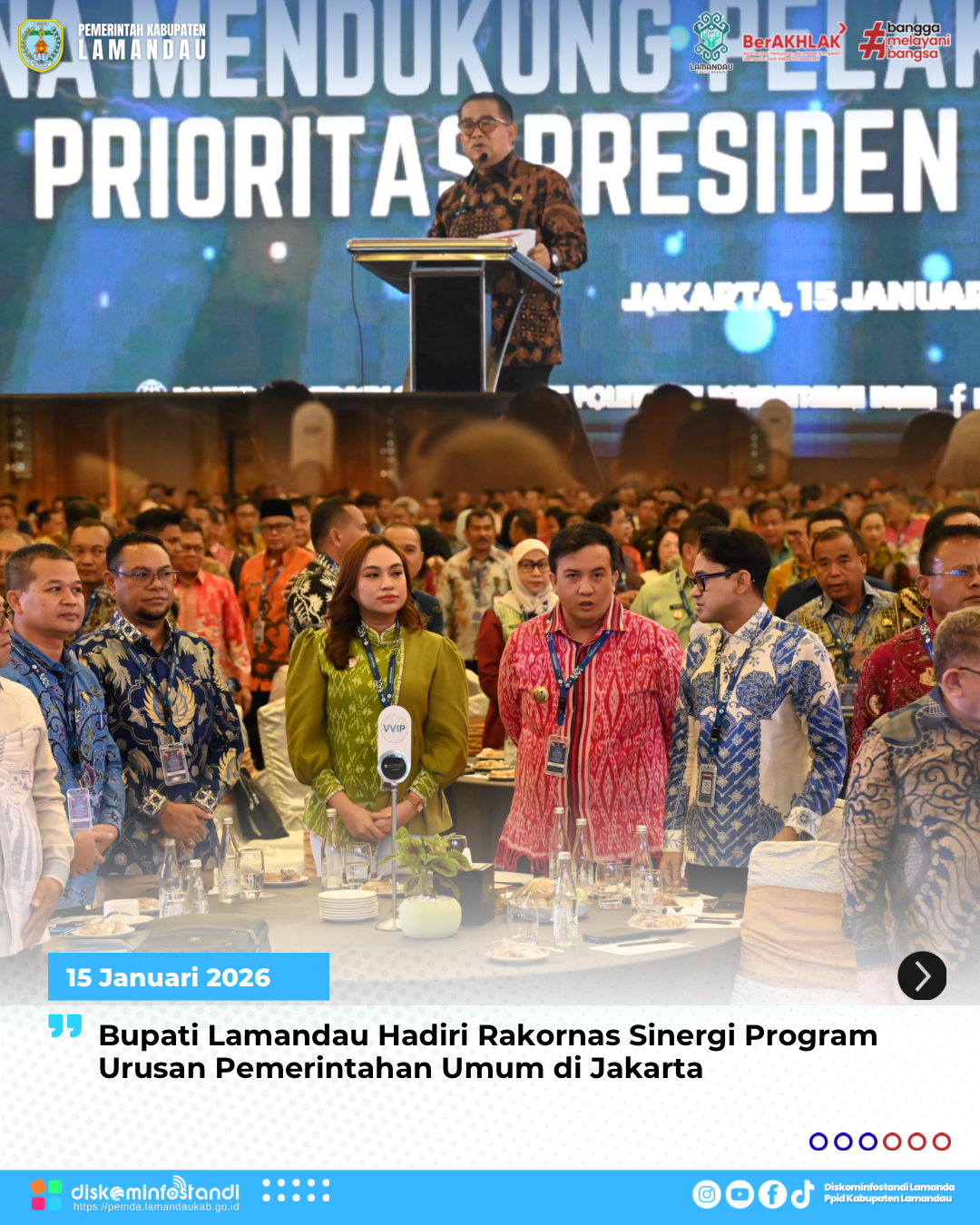 Jakarta – Bupati Lamandau, Rizky Aditya Putra, menghadiri Rapat Koordinasi Nasional (Rakornas) Sinergi Pelaksanaan Program dan Kegiatan Urusan Pemerintahan Umum di Daerah guna mendukung pelaksanaan Program Prioritas Presiden dan Asta Cita. Kegiatan tersebut berlangsung di Hotel Pullman Jakarta Central Park, Kamis (15/1/2026).