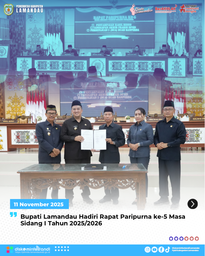 Dalam sambutannya, Bupati Lamandau menyampaikan apresiasi dan terima kasih kepada DPRD Kabupaten Lamandau atas kerja sama yang baik selama proses pembahasan kedua Raperda tersebut. Ia menegaskan bahwa kedua Raperda ini memiliki arti penting bagi penguatan arah pembangunan daerah ke depan.