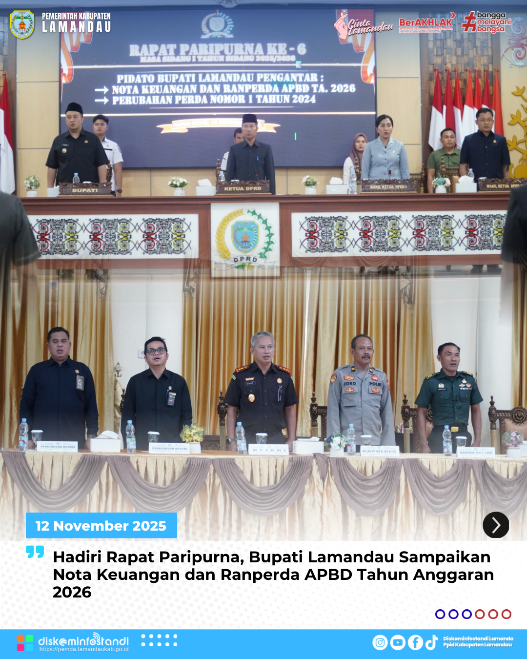 Rapat yang dipimpin Ketua DPRD tersebut mengagendakan penyampaian pandangan umum fraksi-fraksi terhadap Nota Keuangan dan Rancangan Peraturan Daerah (Ranperda) tentang APBD Kabupaten Lamandau Tahun Anggaran 2026.