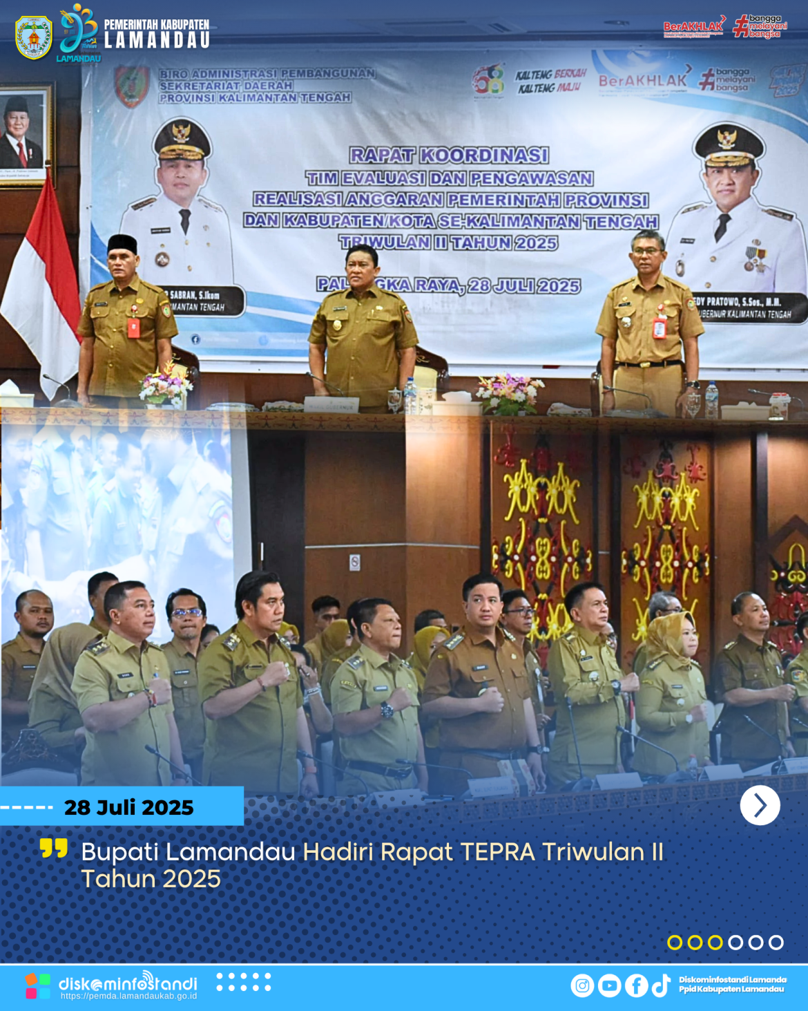 Palangka Raya — Bupati Lamandau, Rizky Aditya Putra menghadiri Rapat Tim Evaluasi dan Pengawasan Realisasi Anggaran (TEPRA) Triwulan II Tahun 2025 yang diselenggarakan pada Senin (28/7/2025) di Aula Eka Hapakat, Kantor Gubernur Kalimantan Tengah.