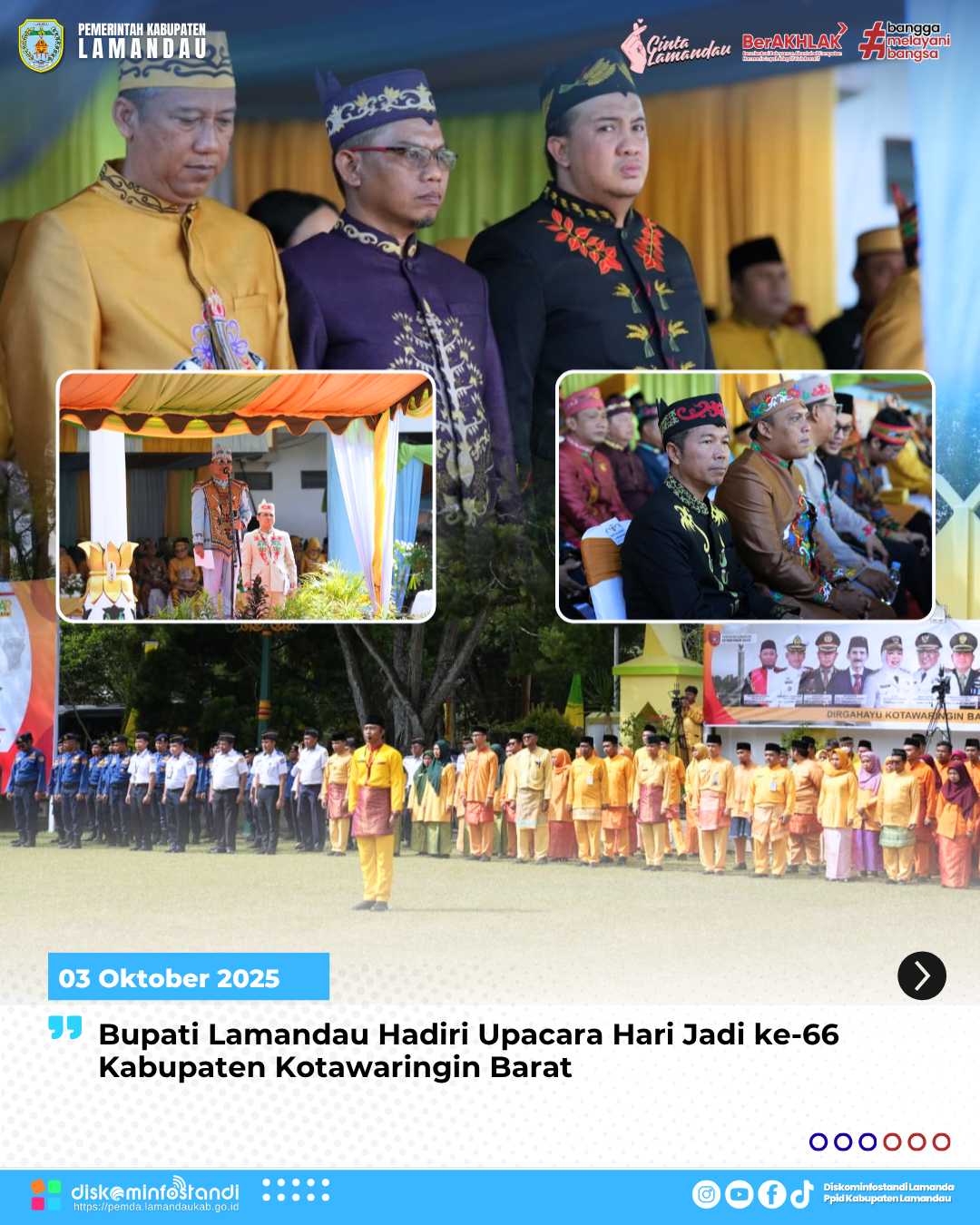“Selamat hari jadi yang ke-66 untuk Kabupaten Kotawaringin Barat. Semoga Kobar semakin maju, masyarakatnya sejahtera, dan terus menjadi mitra yang solid bagi daerah-daerah tetangga, termasuk Kabupaten Lamandau, dalam membangun Kalimantan Tengah,” ujar Bupati Rizky. (Diskominfostandi)