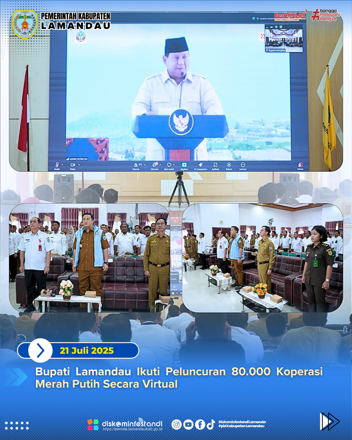 Nanga Bulik – Bupati Lamandau, Rizky Aditya Putra, mengikuti acara Peluncuran Kelembagaan 80.000 Koperasi Desa/Kelurahan Merah Putih secara virtual pada Senin (21/7/2025), bertempat di Aula BPKPD Kabupaten Lamandau. Kegiatan tersebut turut dihadiri oleh perwakilan Forkopimda, Kepala Perangkat Daerah, Camat, Kepala Desa/Lurah, Ketua BPD, serta pemangku kepentingan lainnya.