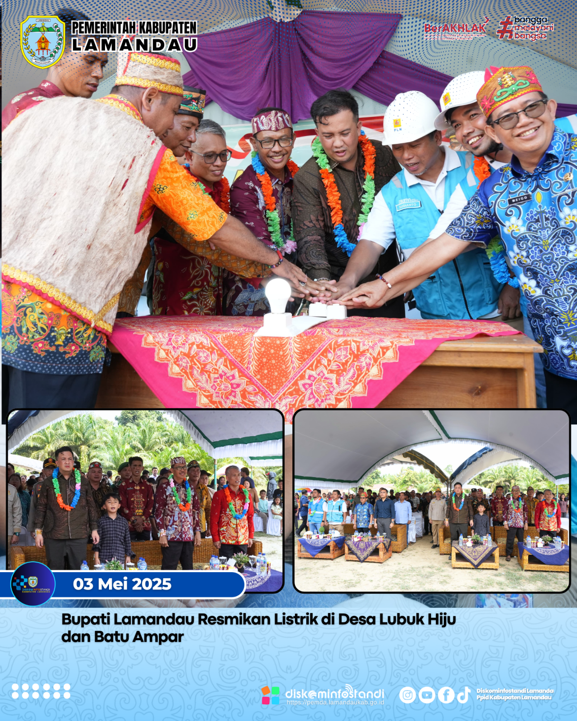 Lubuk Hiju – Bupati Lamandau, Risky Aditya Putra, didampingi Wakil Bupati Abdul Hamid, meresmikan pengoperasian jaringan listrik di Desa Lubuk Hiju dan Desa Batu Ampar, Kecamatan Menthobi Raya, Sabtu (3/5/2025).