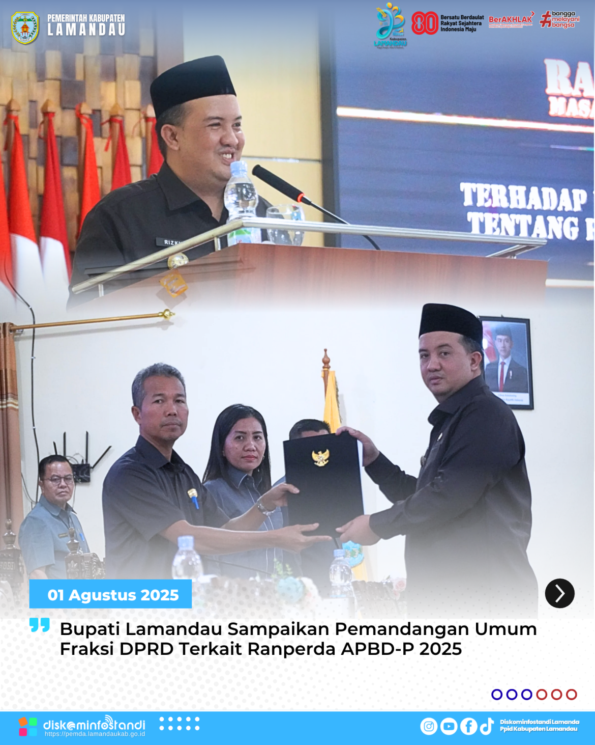 Nanga Bulik – Bupati Lamandau Rizky Aditya Putra menyampaikan tanggapan resmi terhadap pemandangan umum fraksi-fraksi DPRD Kabupaten Lamandau dalam Rapat Paripurna ke-8 Masa Sidang III Tahun 2024/2025, Jumat (1/8) siang.