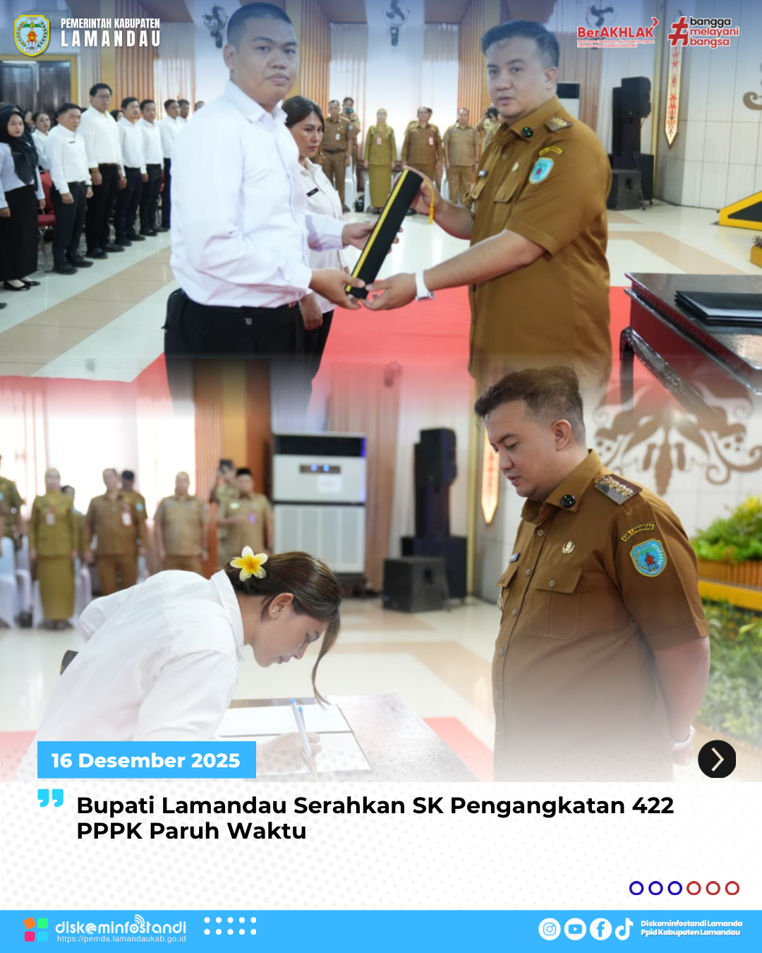 Nanga Bulik – Bupati Lamandau, Rizky Aditya Putra, secara resmi menyerahkan Surat Keputusan (SK) Pengangkatan Pegawai Pemerintah dengan Perjanjian Kerja (PPPK) Paruh Waktu kepada 422 peserta di lingkungan Pemerintah Kabupaten Lamandau. Penyerahan SK tersebut berlangsung di GPU Lantang Torang, Selasa (16/12/2025).