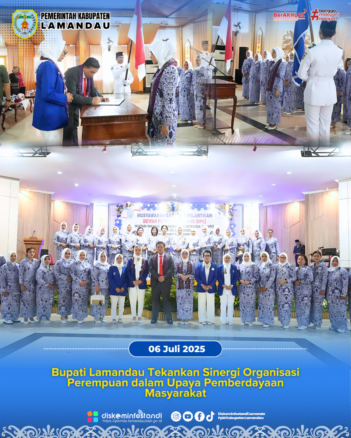 Nanga Bulik – Komitmen Pemerintah Kabupaten Lamandau dalam mendorong peran aktif organisasi perempuan kembali ditegaskan pada acara pelantikan dan pengukuhan kepengurusan Dewan Kerajinan Nasional Daerah (Dekranasda), Tim Pembina Posyandu (TP Posyandu), dan Ikatan Wanita Pengusaha Indonesia (IWAPI) Kabupaten Lamandau periode 2025–2030, yang berlangsung di GPU Lantang Torang, Minggu (06/07).