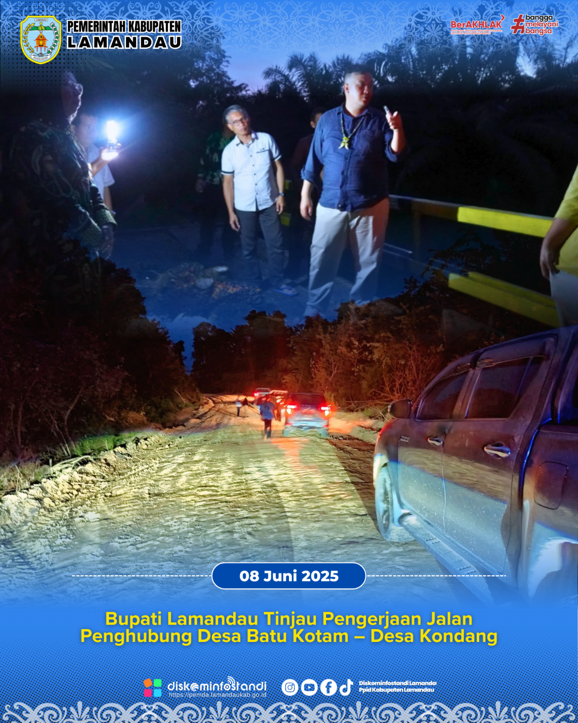 Batu Kotam – Bupati Lamandau, Rizky Aditya Putra, didampingi Sekretaris Daerah dan sejumlah Kepala Organisasi Perangkat Daerah (OPD), meninjau pengerjaan jalan penghubung antara Desa Batu Kotam, Kecamatan Bulik, Kabupaten Lamandau, dengan Desa Kondang, Kabupaten Kotawaringin Barat, pada Minggu (8/6/2025).