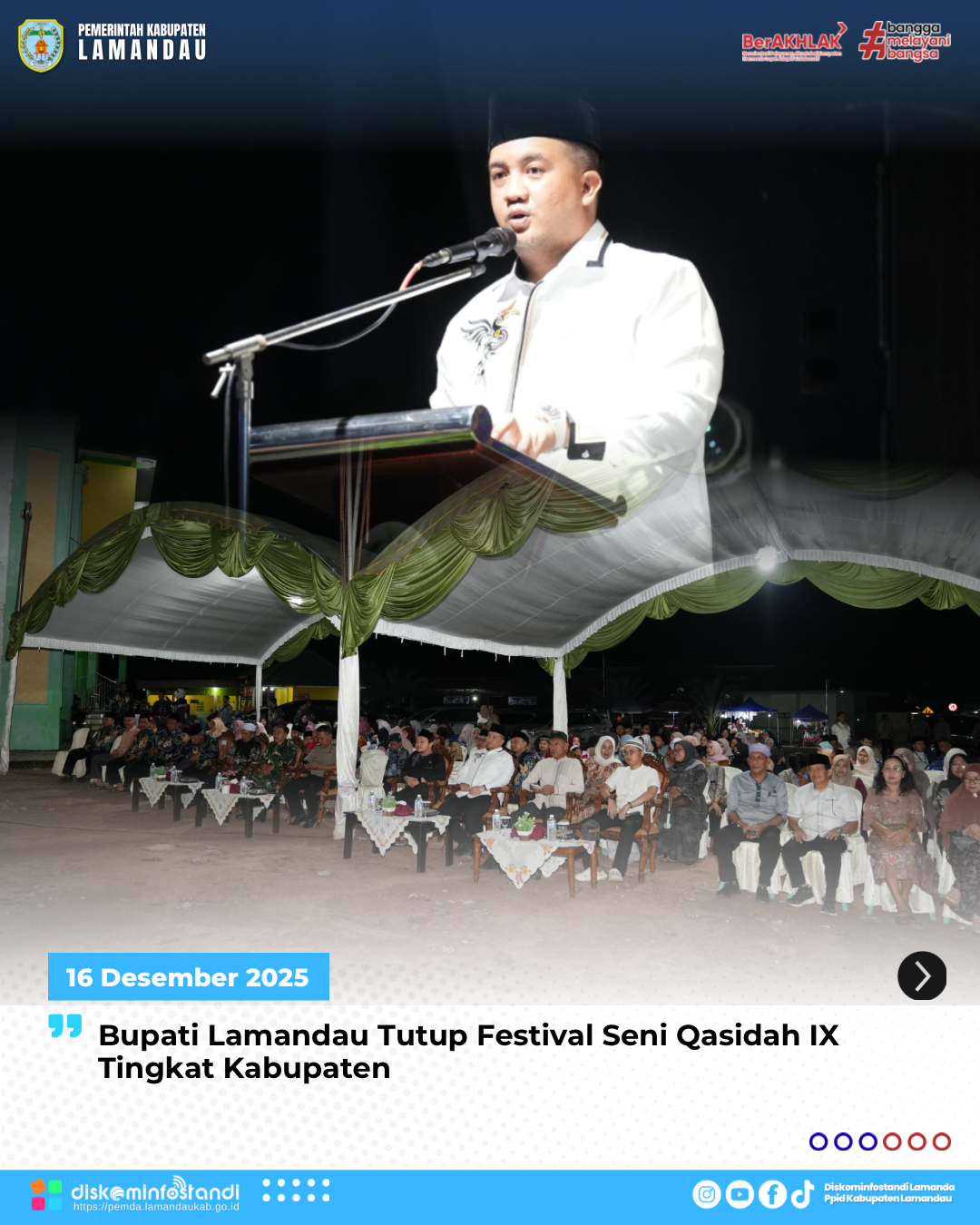 Dalam sambutannya, Bupati Lamandau menyampaikan bahwa Festival Seni Qasidah merupakan sarana dakwah yang menanamkan nilai-nilai keimanan, akhlak mulia, serta mempererat ukhuwah Islamiyah di tengah masyarakat.