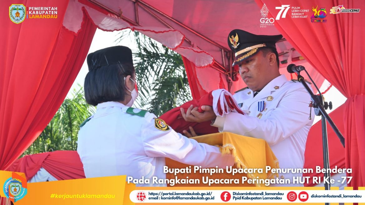 Lamandau Bergerak Cepat (LBC) – Bupati Lamandau Hendra Lesmana kembali bertindak sebagai Inspektur Upacara (Irup) penurunan Bendera merah putih pada rangkaian peringatan Hari Ulang Tahun (HUT) ke-77 Kemerdekaan Republik Indonesia (RI) tahun 2022 di Halaman Kantor Bupati Lamandau, rabu (17/08) sore.