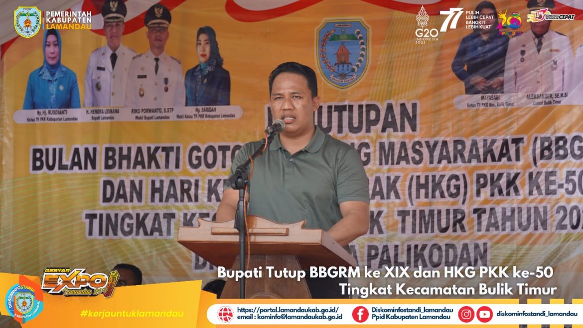 Lamandau Bergerak Cepat (LBC) – Bupati Lamandau Hendra Lesmana resmi menutup Bulan Bhakti Gotong Royong Masyarakat (BBGRM) ke XIX dan HKG PKK ke-50 Tingkat Kecamatan Bulik Timur Tahun 2022 di desa Nanga Palikodan, Kamis (11/08).