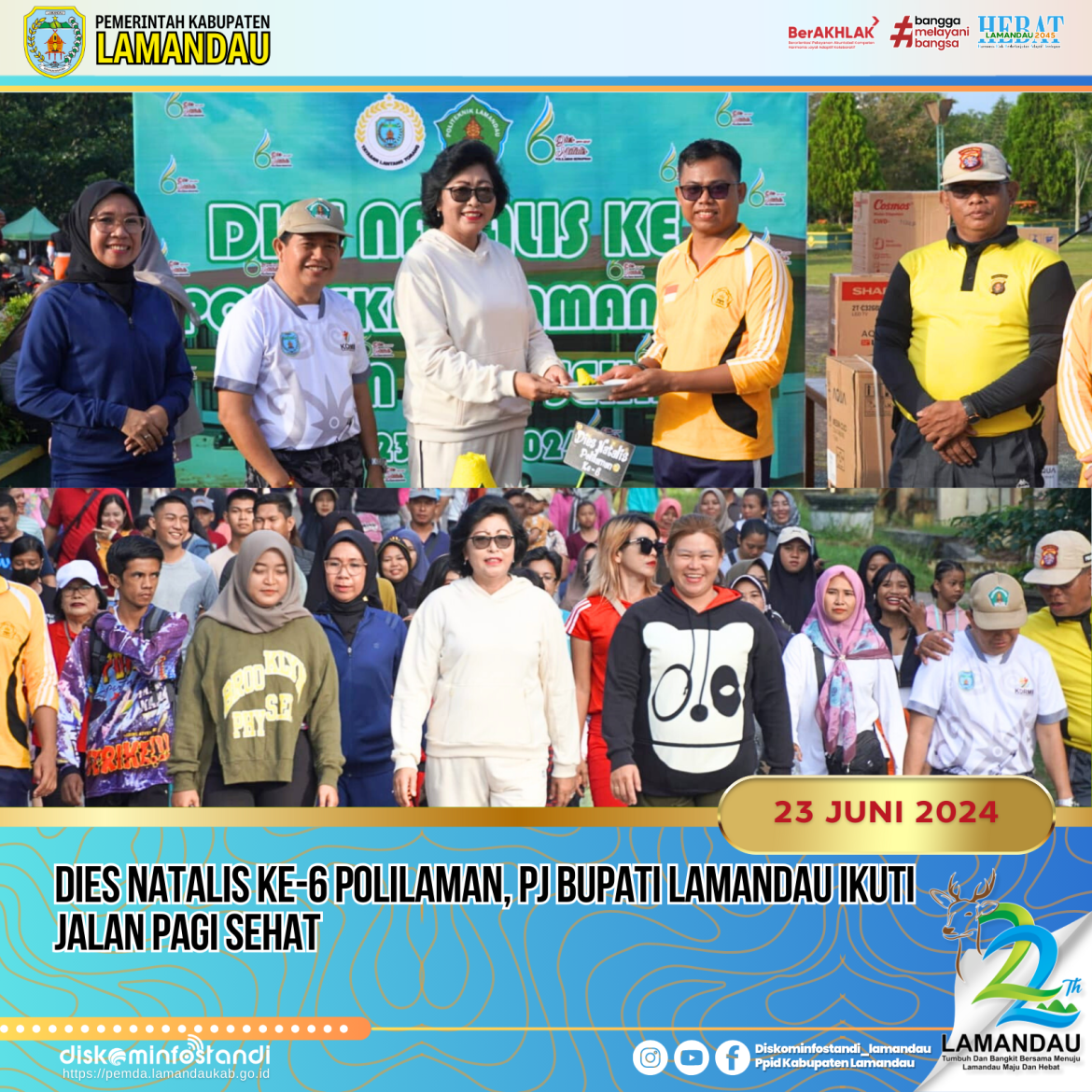 Nanga Bulik – Dalam rangka Dies Natalis Ke-6 Politeknik Lamandau (Polilaman), Penjabat (Pj) Bupati Lamandau, Lilis Suriani yang didampingi Asisten II dan Kepala Dinas Kesehatan mengikuti jalan pagi sehat yang dipusatkan di Bundaran Rusa Nanga Bulik, Minggu (23/6/2024).