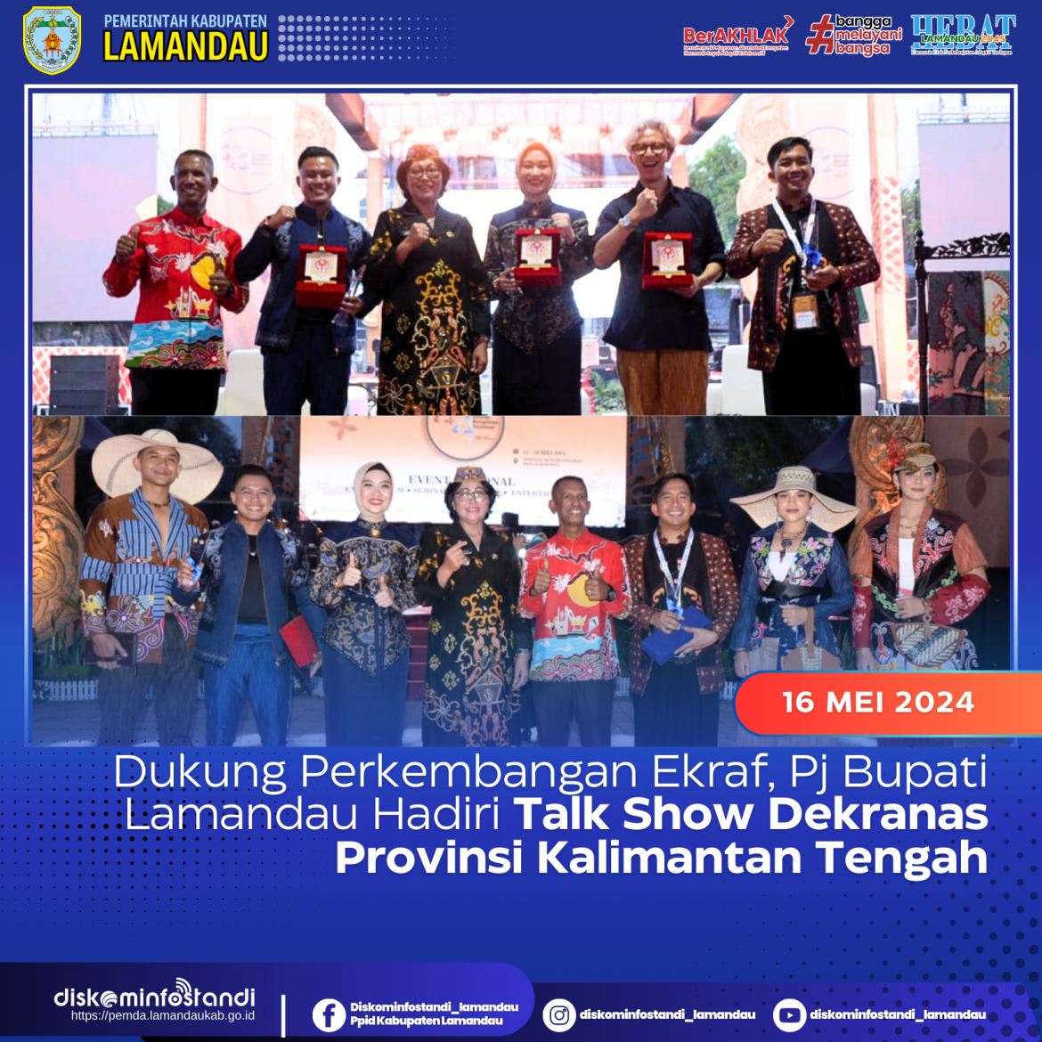 Juga menghadirkan sejumlah narasumber utama diantaranya Irna Agustine Marzuki, Ketua Umum PIP PT Bank Kalteng, dan Steffan Adji, seorang desainer fashion terkemuka dari Kalimantan Tengah. Pj Bupati juga mengapresiasi para moderator dan narasumber dengan menyerahkan plakat penghargaan, karena telah berbagi ilmu dan wawasannya, serta kontribusi dalam mensukseskan talk show dan mendorong perkembangan ekonomi kreatif di Kalimantan Tengah. (Diskominfostandi)
