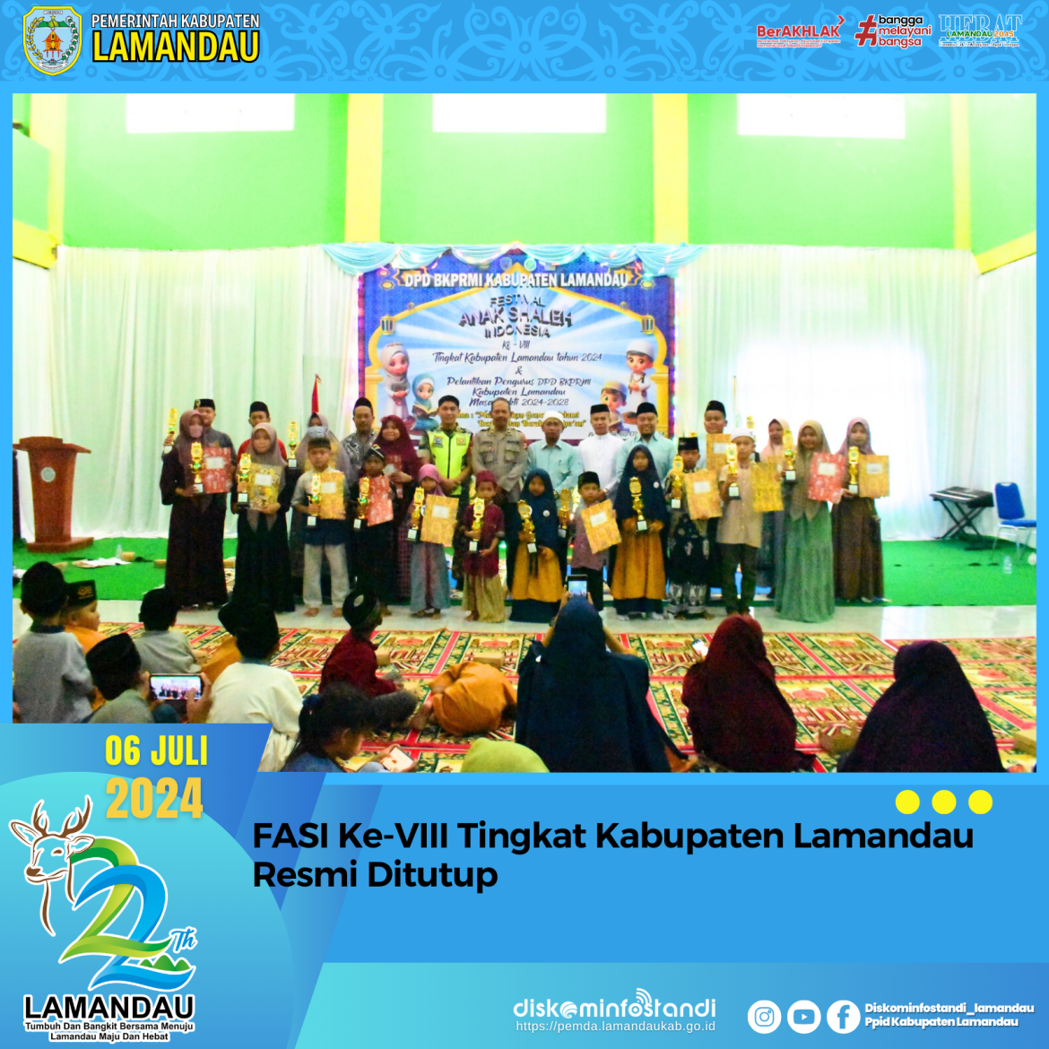 Nanga Bulik – Pj Bupati Lamandau yang diwakili oleh Kepala Dinas Sosial Kabupaten Lamandau Syaifuddin Zuhri menghadiri sekaligus menutup kegiatan Festival Anak Sholeh Indonesia (FASI) Ke- VIII Tingkat Kabupaten Lamandau, Sabtu (6/7/2024) di Gedung LPTQ Nanga Bulik.