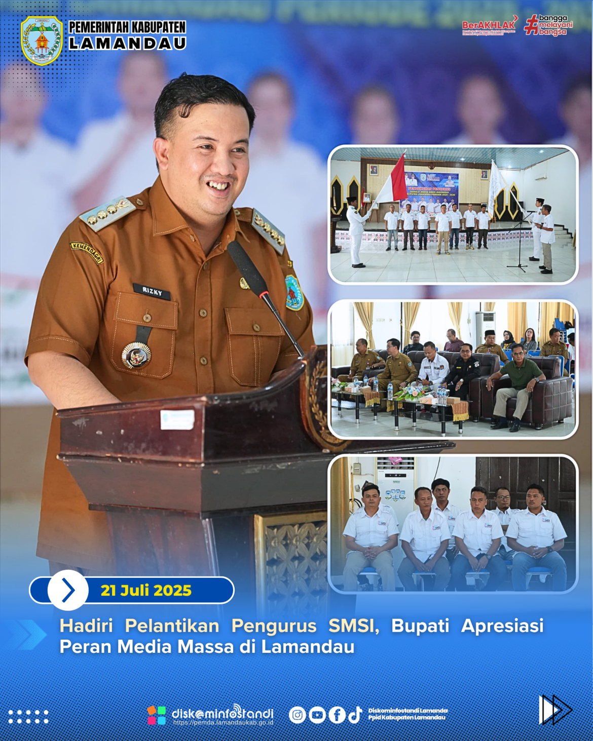 Nanga Bulik – Bupati Lamandau, Rizky Aditya Putra, mengapresiasi peran media massa dalam mendukung pembangunan di Kabupaten Lamandau. Hal tersebut disampaikannya saat menghadiri pelantikan pengurus Serikat Media Siber Indonesia (SMSI) Kabupaten Lamandau yang digelar di Aula Kantor Bappedalitbang, Senin (21/7/2025).