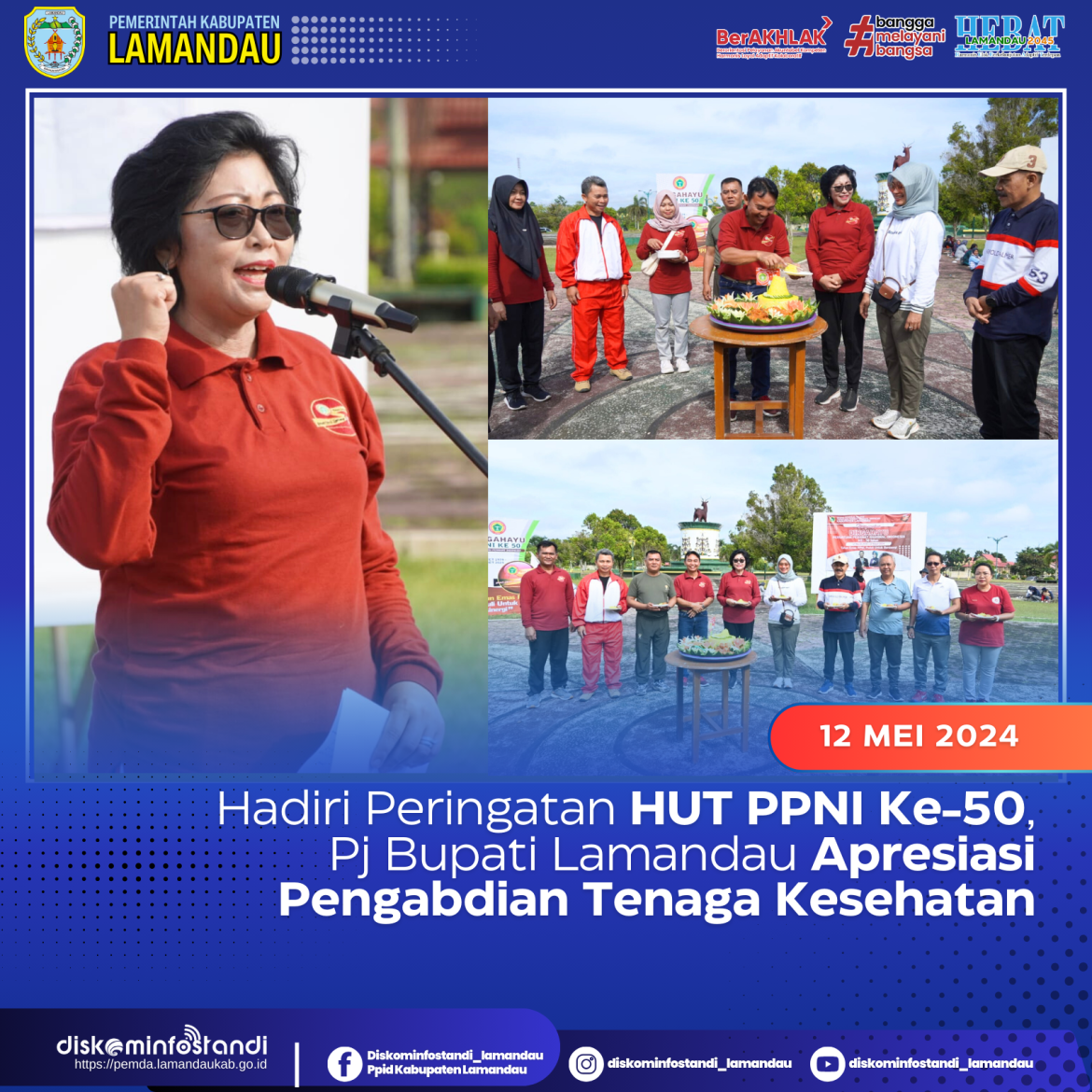 “Jadikan momentum ini sebagai pembaharuan komitmen untuk memberikan pelayanan kesehatan yang berkualitas dan meningkatkan derajat kesehatan masyarakat Kabupaten Lamandau”, kata Pj Bupati Lamandau. Acara yang bertemakan “Tahun Emas PPNI, Peduli Untuk Bersinergi” ini juga dirangkai dengan kegiatan Jalan santai dan dihadiri oleh Perwakilan Forkopimda, Kepala OPD, Pj. Ketua TP PKK Kabupaten Lamandau, dan Camat Bulik. (Diskominfostandi)