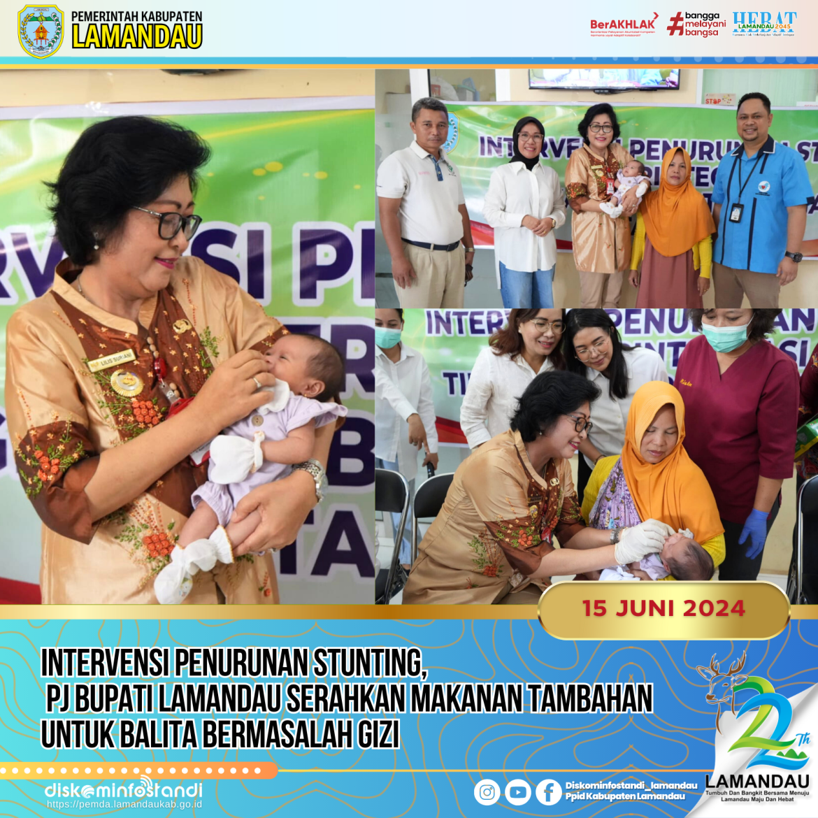 Penyerahan makanan tambahan dilaksanakan dalam kegiatan intervensi penurunan stunting terintegrasi tingkat kabupaten Lamandau tahun 2024. Hal ini menandakan keseriusan Pemkab Lamandau untuk terus melakukan berbagai upaya pencegahan stunting dan sekaligus menangani stunting.