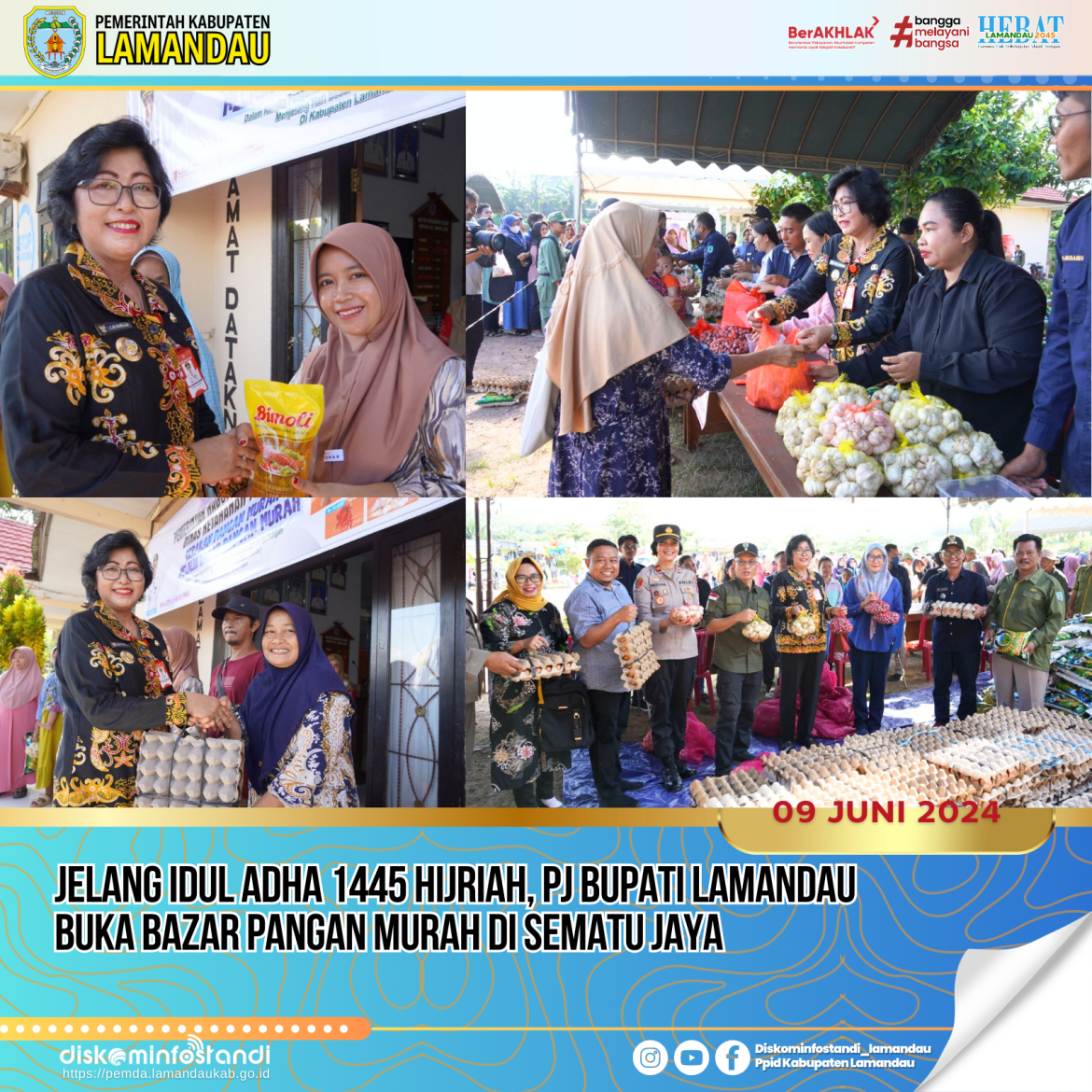 “Kami dari Pemkab Lamandau menggelar bazar pangan murah menjelang Hari Besar Keagamaan Nasional (HBKN) Hari Raya Idul Adha 1445 hijriah ini untuk menjaga stabilitas harga karena ada kecenderungan peningkatan kebutuhan pokok masyarakat yang diikuti dengan kenaikan harga”, kata Pj Bupati Lamandau.