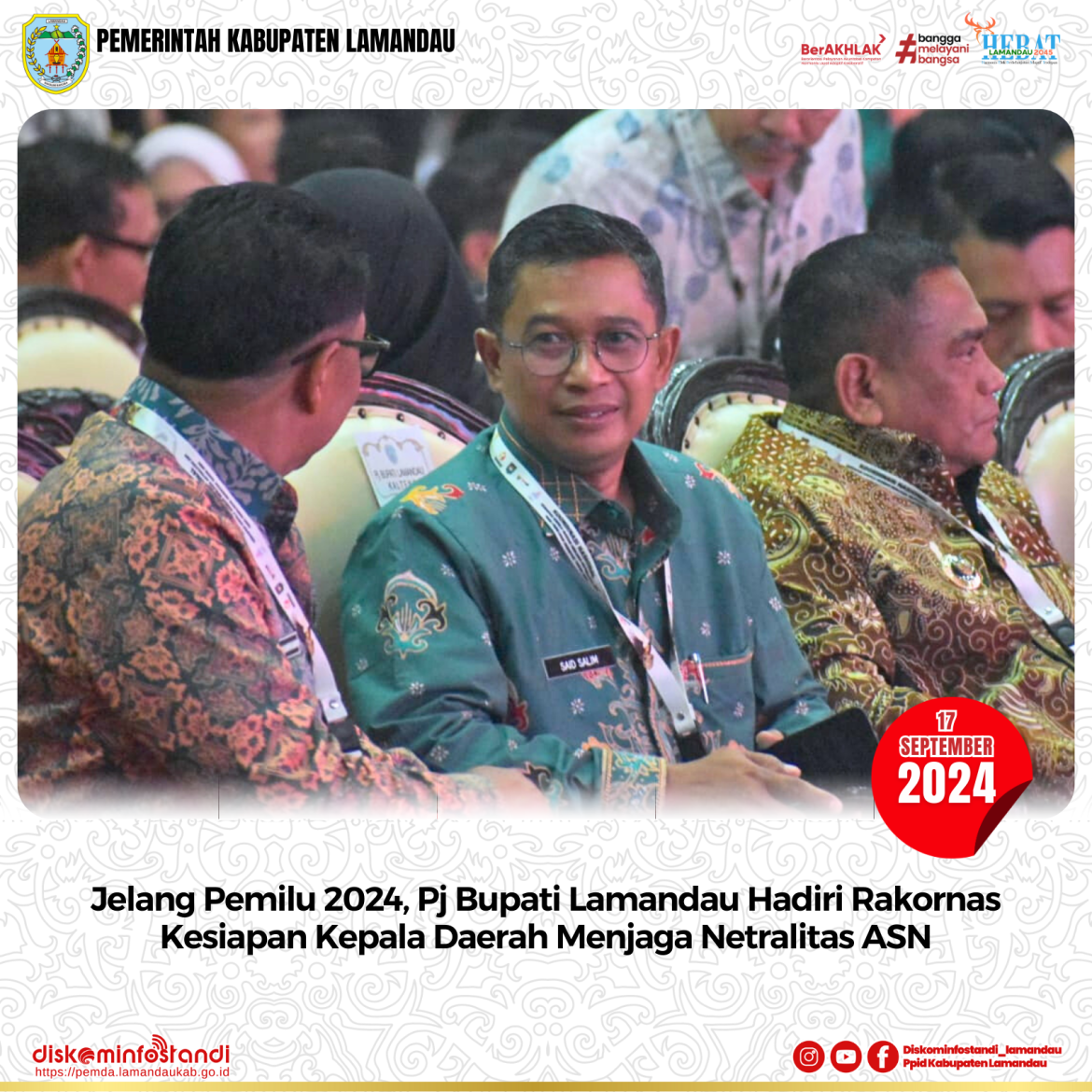Jakarta – Penjabat (Pj) Bupati Lamandau, Said Salim bersama Sekretaris Daerah Muhamad Irwansyah menghadiri Rapat Koordinasi Nasional (Rakornas) kesiapan kepala daerah menjaga netralitas ASN pada Pemilu Serentak Tahun 2024, Selasa (17/9/2024) di Ecovention Ancol, Jakarta Utara.