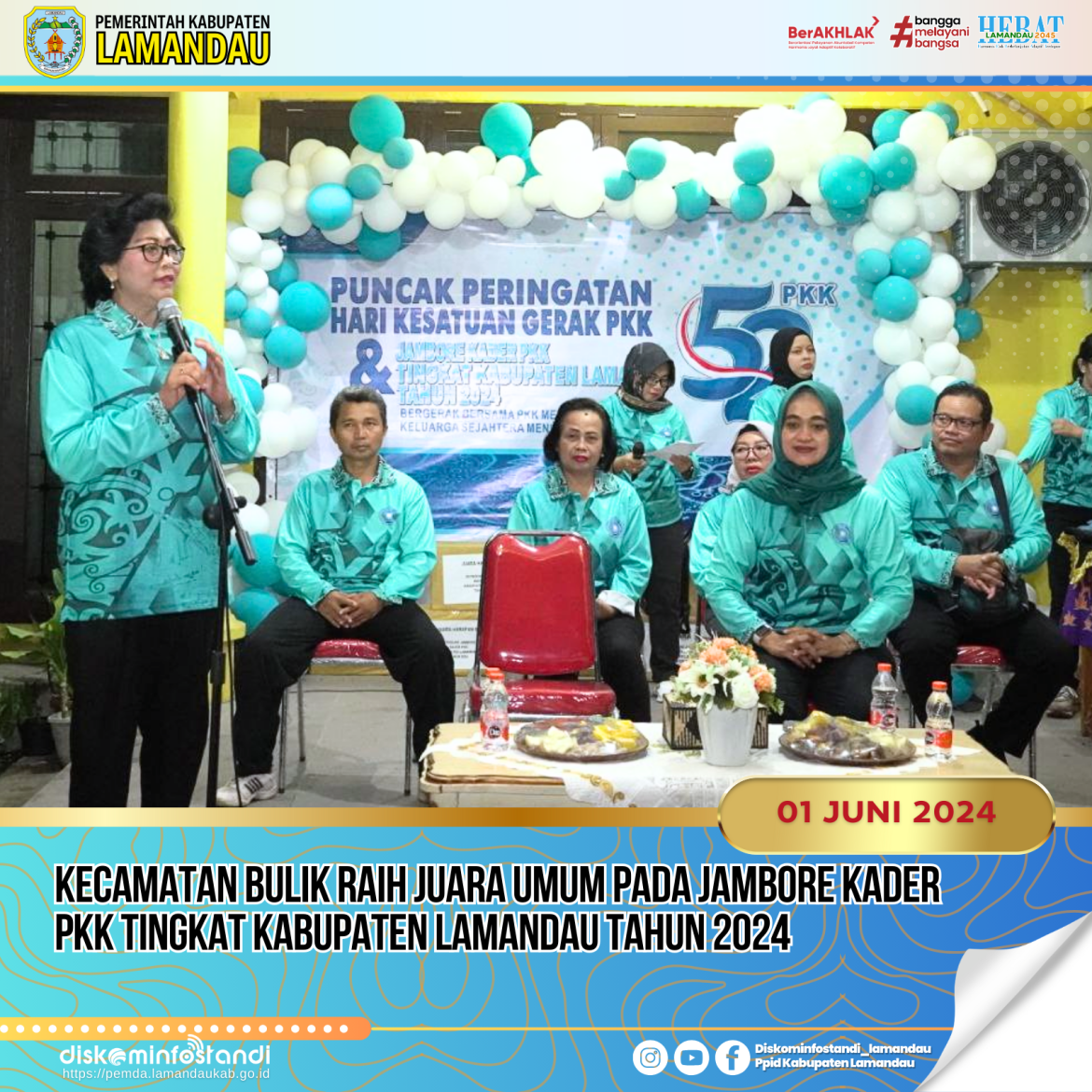 Di tempat yang sama Pj Ketua TP PKK Kabupaten Lamandau, Endah Rahayuningsih, menyampaikan ucapan terima kasih kepada Pj Bupati Lamandau sebagi pembina TP PKK Kabupaten Lamandau yang telah mendukung kegiatan tersebut. Dengan berakhirnya rangkaian kegiatan tersebut, Kecamatan Bulik keluar sebagai juara umum dalam Jambore PKK tingkat Kabupaten Lamandau tahun 2024. (Diskominfostandi)
