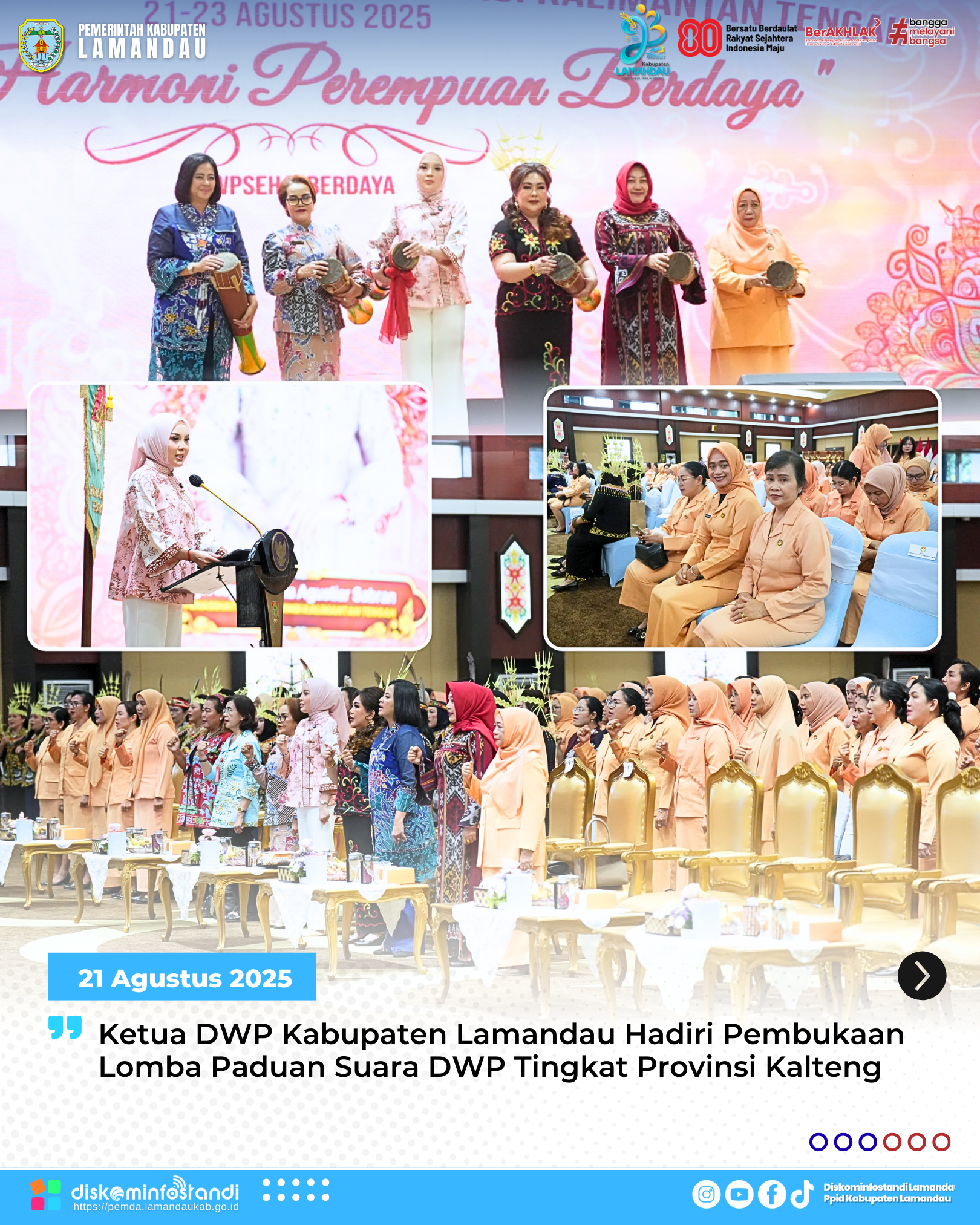 Palangka Raya – Ketua Dharma Wanita Persatuan (DWP) Kabupaten Lamandau, Endah Rahayuningsih M. Irwansyah, didampingi Sekretaris DWP Herni Tiryan Kuderon, menghadiri pembukaan Lomba Paduan Suara DWP Kabupaten/Kota, Organisasi Perangkat Daerah (OPD), dan Instansi Vertikal Tingkat Provinsi Kalimantan Tengah Tahun 2025. Acara tersebut berlangsung di Aula Jayang Tingang, Kantor Gubernur Kalteng, pada Kamis (21/08/2025).