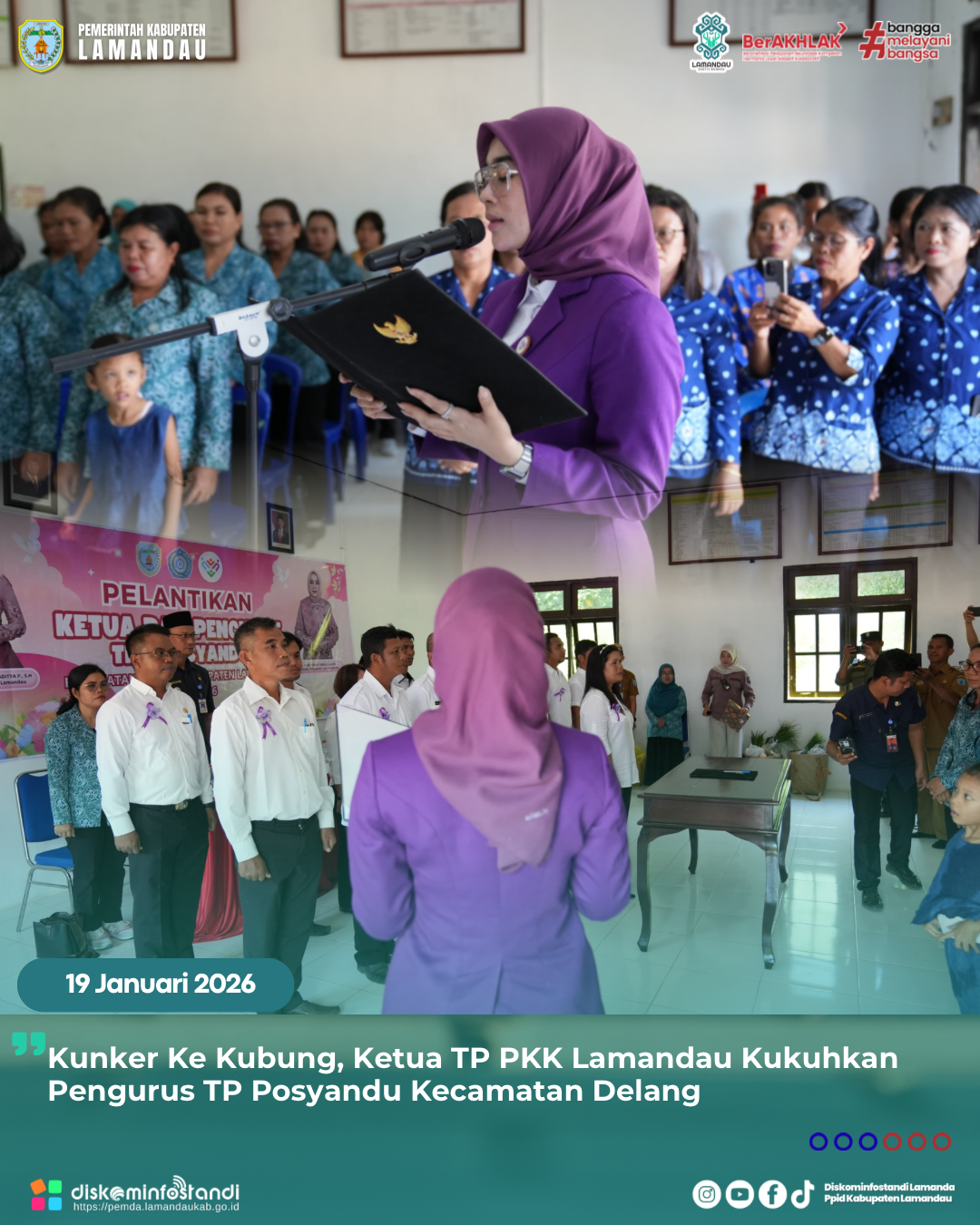 Kubung – Dalam rangka kunjungan kerja ke Kecamatan Delang, Ketua Tim Penggerak PKK Kabupaten Lamandau, Norol Latifah Rizky Aditya Putra, secara resmi mengukuhkan Ketua dan Pengurus Tim Posyandu Kecamatan Delang. Kegiatan pengukuhan dilaksanakan di Desa Kubung, Senin (19/1/2026).