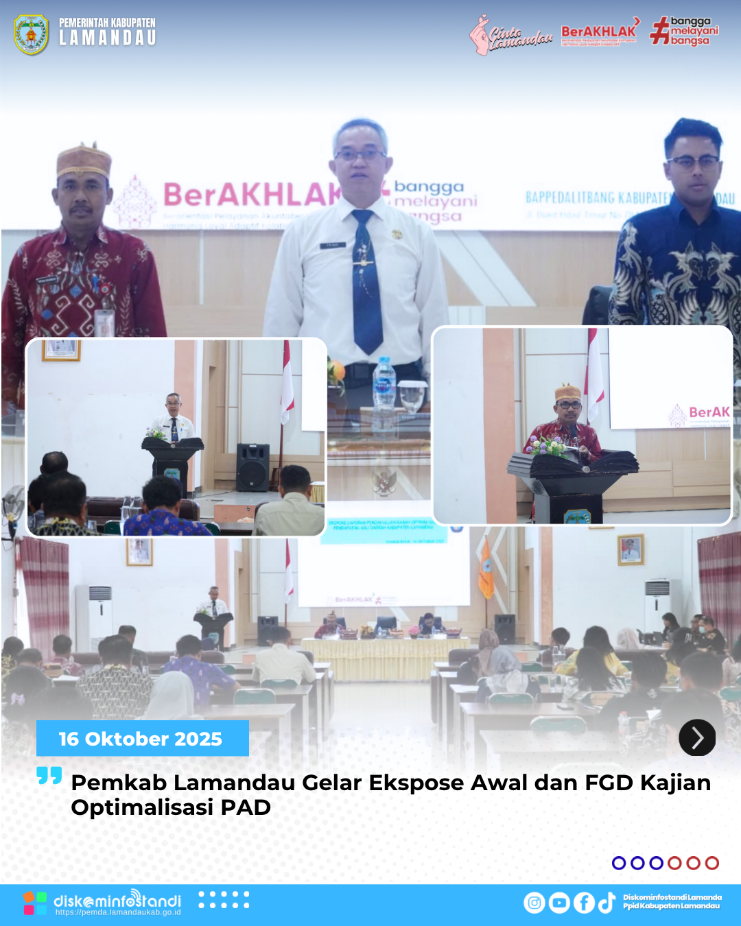 Nanga Bulik – Pemerintah Kabupaten (Pemkab) Lamandau melalui Badan Perencanaan Pembangunan, Penelitian, dan Pengembangan Daerah (Bappedalitbang) menggelar kegiatan Ekspose Awal dan Focus Group Discussion (FGD) Kajian Optimalisasi Pendapatan Asli Daerah (PAD) Kabupaten Lamandau Tahun 2025, yang berlangsung di Aula BPKPD Kabupaten Lamandau, Kamis (16/10/2025).