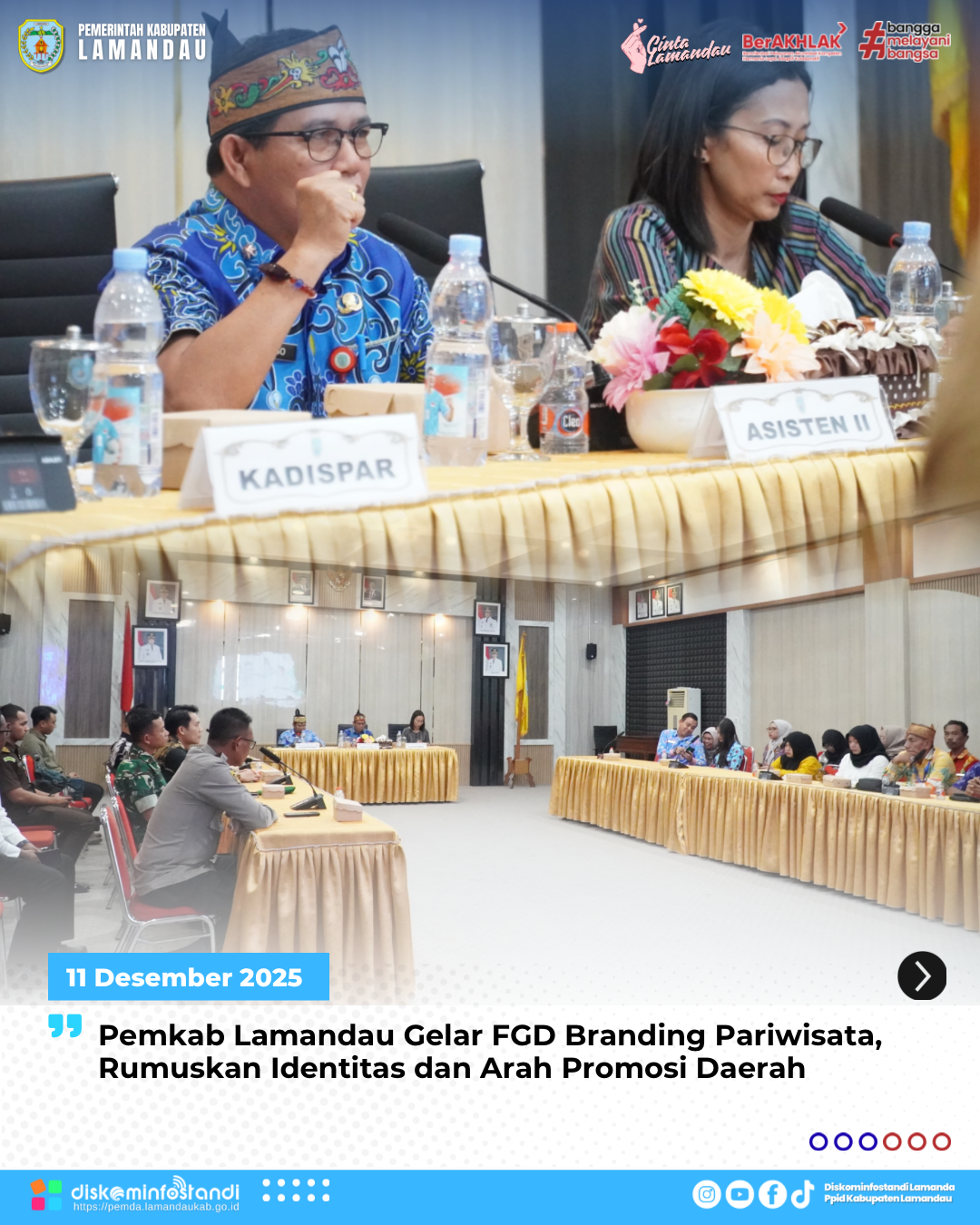 Nanga Bulik — Sebagai upaya merumuskan arah promosi dan penguatan identitas pariwisata daerah, Pemerintah Kabupaten Lamandau menggelar Focus Group Discussion (FGD) Branding Pariwisata di Aula Setda Lamandau, Kamis (11/12).