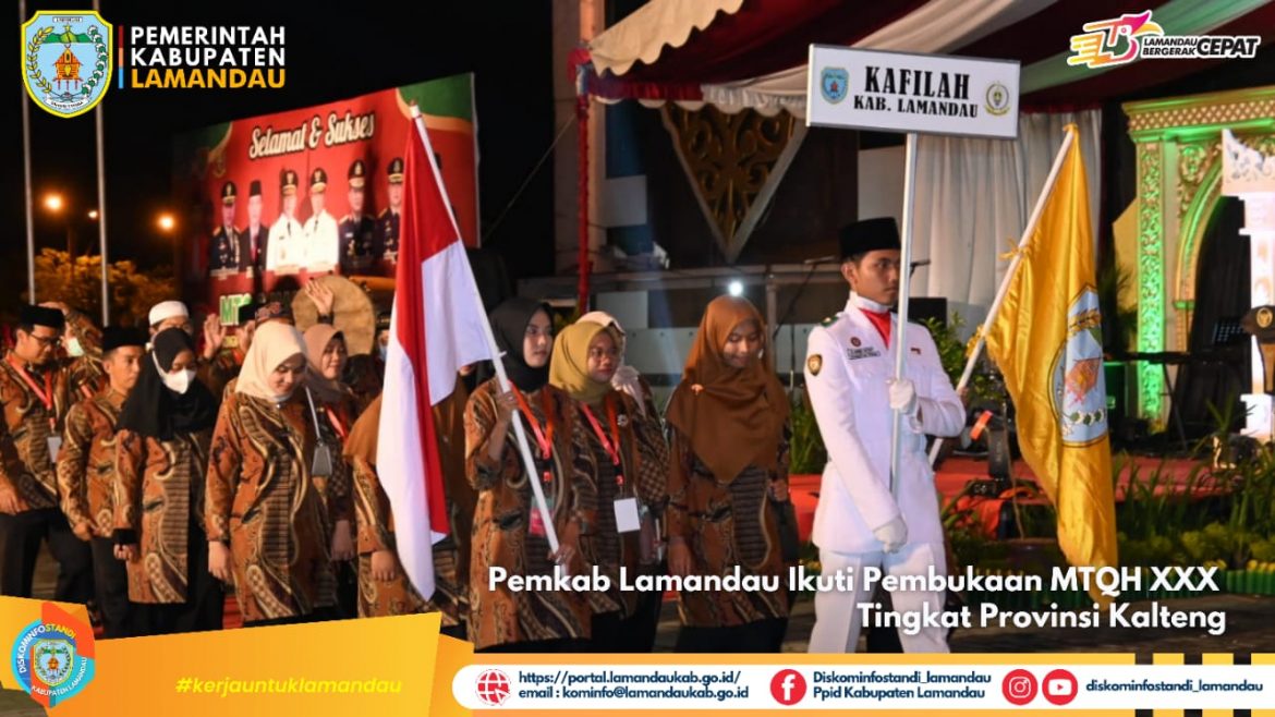Palangka Raya – Bupati Lamandau yang diwakili oleh Kepala Dinas Pendidikan dan Kebudayaan yang sekaligus pimpinan kafilah Kabupaten Lamandau, Abdul Kohar bersama seluruh Kafilah Lamandau mengikuti pembukaan Musabaqah Tilawatil Qur’an dan Hadits (MTQH)Ke – XXX Tingkat Provinsi Kalimantan Tengah (Kalteng), Sabtu (23/7) di Halaman Masjid Darussalam Palangka Raya.