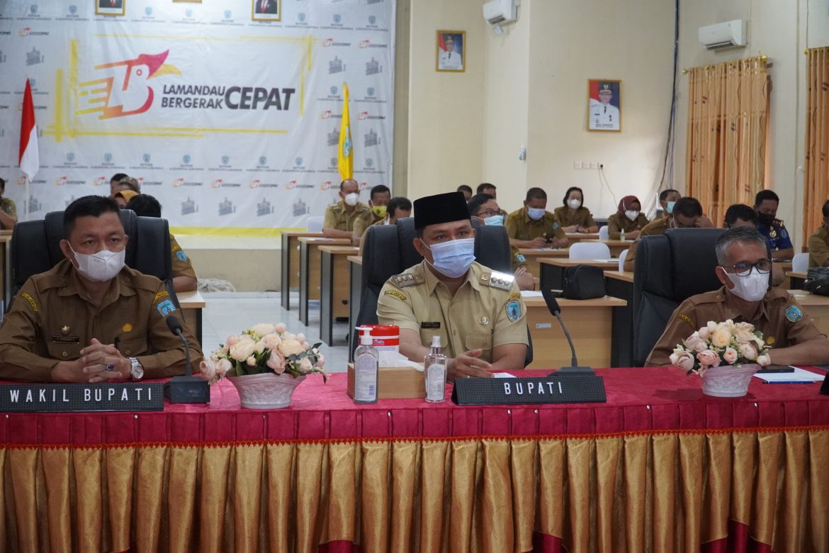 Lamandau Bergerak Cepat (LBC)– Bupati Lamandau Hendra Lesmana di dampingi wakil Bupati Riko Porwanto mengikuti kegiatan Penyerahan Hasil Evaluasi Akuntabilitas Kinerja dan Pelaksanaan Reformasi Birokrasi Instansi Pemerintah tahun 2021 secara virtual melalui Zoom Meeting di Aula BKPSDM Kabupaten Lamandau Jalan Komplek Perkantoran Bukit Hibul, Nanga Bulik, Selasa (05/04).