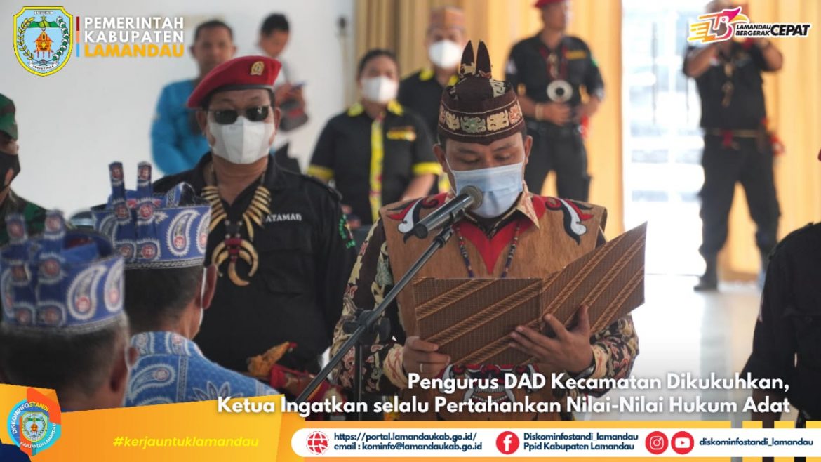 Lamandau Bergerak Cepat (LBC) – Bupati Lamandau Hendra Lesmana selaku Ketua Dewan Adat Dayak (DAD) Kabupaten Lamandau hadiri pengukuhan pengurus DAD Kecamatan Sematu Jaya, Kecamatan Bulik, Kecamatan Batang Kawa, dan Kecamatan Bulik Timur Masa Bhakti 2021-2026 di Aula Bappedalitbang, Selasa (26/07).