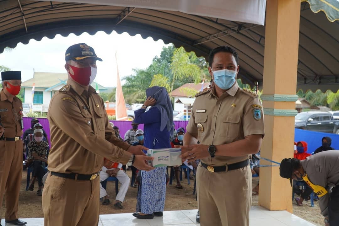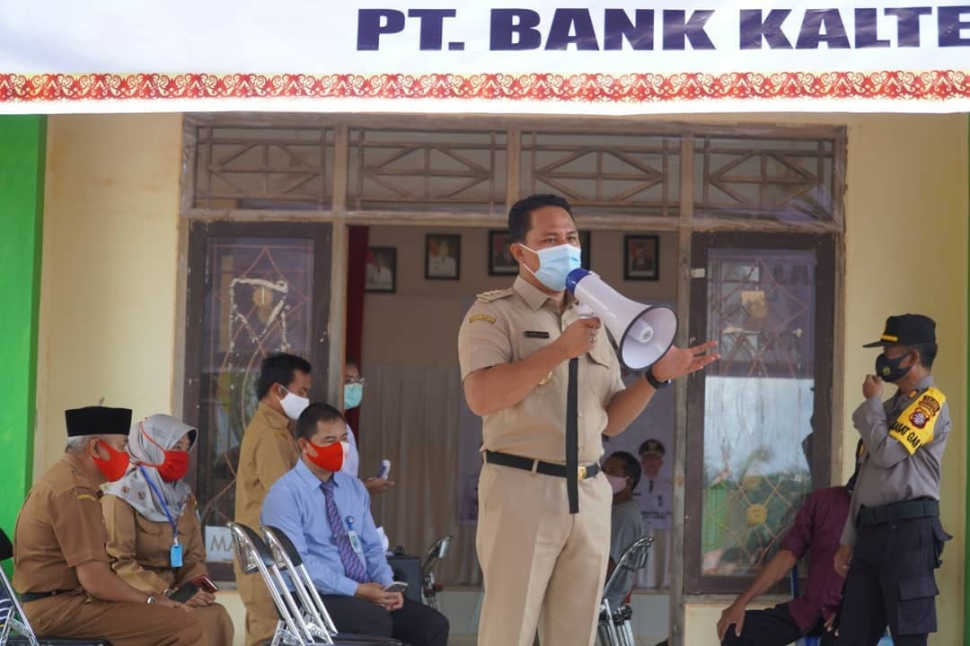 LAMANDAU – Bupati Lamandau Hendra Lesmana menghadiri penyaluran Bantuan Sosial Tunai bagi masyarakat terdampak bencana non alam wabah Covid-19 di Kecamatan Menthobi Raya, selasa (18/8). BST yang bersumber dari APBD Kabupaten Lamandau disalurkan melalui Bank Kalteng ini diserahkan secara simbolis oleh Bupati kepada 2.119 Kepala Keluarga Penerima Manfaat (KPM) di dua tempat yaitu di aula kantor desa Bukit Raya, dan di aula kecamatan Menthobi Raya.Pada sambutannya Bupati menyinggung tingkat kesadaran masyarakat yang semakin menurun untuk menggunakan masker dan menjaga jarak, padahal tingkat penyebaran virus di Indonesia masih tinggi sehingga masyarakat di Kabupaten Lamandau harus tetap mematuhi protokol kesehatan.Dari data Satgas Covid19 Kabupaten Lamandau bahwa kasus terkonfirmasi positif di Kabupaten Lamandau berjumlah 20 orang, dengan 18 orang sembuh, 1 orang meninggal dunia, serta 1 orang masih dalam perawatan yang merupakan warga kecamatan menthobi Raya.Turut hadir pada acara tersebut ketua penggerak TP-PKK Lamandau yang sekaligus berkesempatan membagikan masker di tempat yang sama, hadir pula Dandim 1017 LMD, perwakilan Polres Lamandau, dan beberapa Kepala OPD terkait. (Diskominfo)