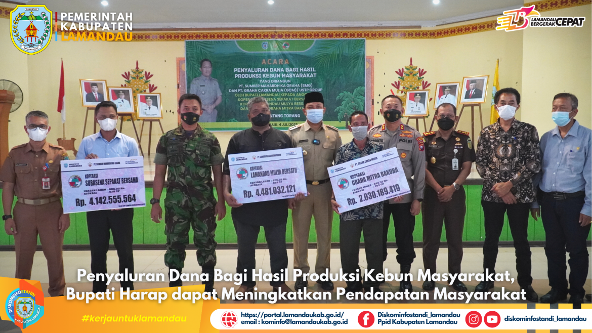 Lamandau Bergerak Cepat (LBC) – Bupati Lamandau Hendra Lesmana menghadiri Penyaluran Dana Bagi Hasil Produksi Kebun Masyarakat yang dibangun oleh PT Sumber Mahardika Graha (SMG) dan PT Graha Cakra Mulia (GCM)/USTP Group kepada anggota Koperasi Subasena Sepakat Bersama, Koperasi Lamandau Mulia Bersatu dan Koperasi Graha Mitra Bakuba, di GPU Lantang Torang, Senin (04/06).
