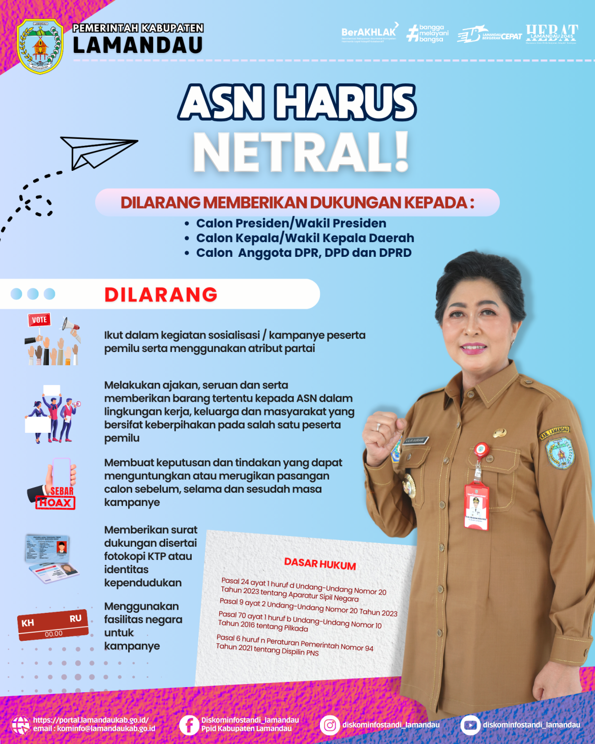 Pegawai ASN di lingkungan Pemerintah Kabupaten Lamandau wajib menjaga dan menegakkan prinsip netralitas ASN dalam pemilihan umum dan pemilihan serentak Tahun 2024, menghindari konflik kepentingan dengan tidak melakukan praktik-praktik intimidatif atau ancaman kepada pegawai ASN dan seluruh elemen masyarakat serta tidak memihak kepada salah satu peserta pemilu, menggunakan medsos secara bijak, serta menolak politik uang dan menolak segala jenis pemberian dalam bentuk apapun.