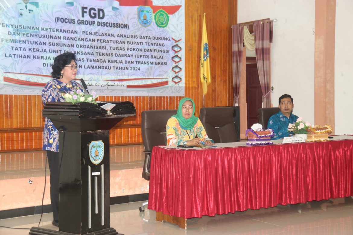 Nanga Bulik – Pj Bupati Lamandau Lilis Suriani membuka kegiatan Focus Grup Discussion, Penyusunan Keterangan/Penjelasan, Analisis Data Dukung, dan Penyusunan Organisasi, Tugas Pokok, Fungsi dan Tata Kerja Unit Pelaksana Teknis Daerah (UPTD) Balai Latihan Kerja pada Dinas Tenaga Kerja dan Transmigrasi di Kabupaten Lamandau tahun 2024, di Aula BPKPD Kabupaten Lamandau, Kamis (4/4).