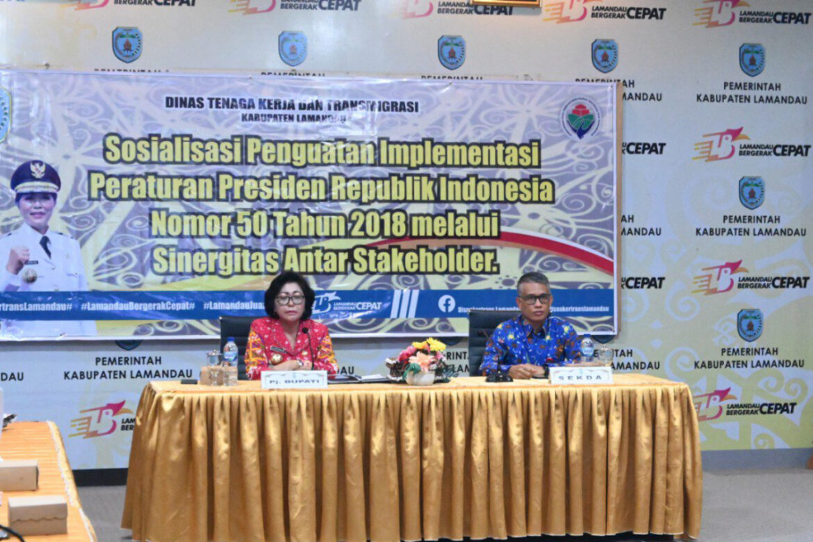 Nanga Bulik – Melalui Dinas Tenaga Kerja dan Transmigrasi, Pemerintah Daerah Kabupaten Lamandau mengadakan sosialisasi penguatan implementasi Peraturan Presiden Republik Indonesia nomor 50 Tahun 2018 melalui kolaborasi dan sinergitas antar stakeholder, di Aula Setda, Kamis (12/10).