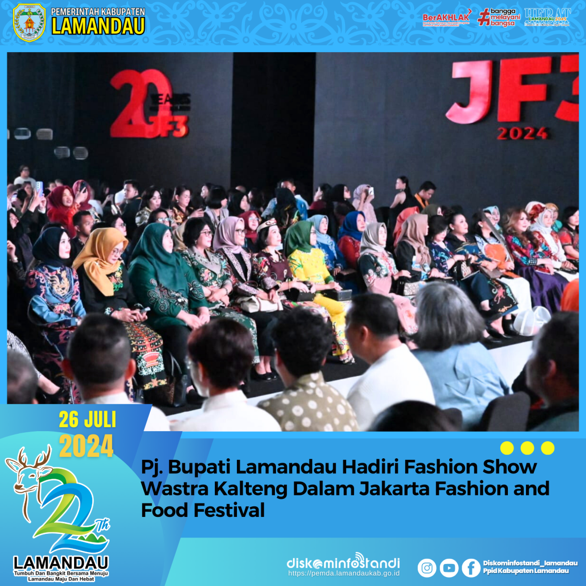 Jakarta – Penjabat (Pj) Bupati Lamandau, Lilis Suriani menghadiri acara Fashion Show Wastra Kalimantan Tengah yang merupakan rangkaian dari Jakarta Fashion and Food Festival (JF3), Jum’at (26/07) bertempat di Summarecon Mall Kelapa Gading, Jakarta Utara.