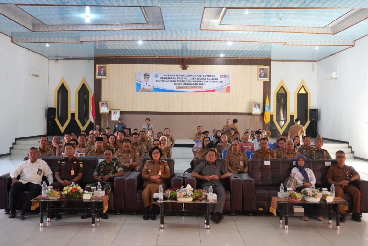 Nanga Bulik – Pj Bupati Lamandau Lilis Suriani hadiri Kick Off penandatangan kontrak Pengadaan Barang/Jasa secara kolektif di Lingkungan Pemerintah Kabupaten Lamandau tahun 2024, di aula Bappedalitbang, Senin (29/1).