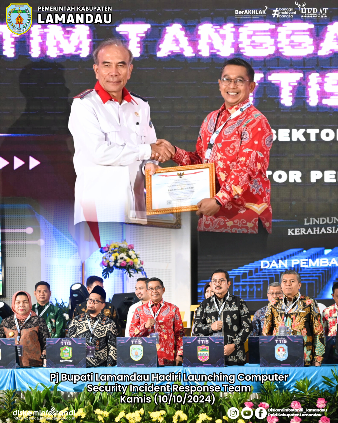 Depok – Penjabat (Pj) Bupati Lamandau, Said Salim yang didampingi Kepala Diskominfostandi menghadiri Launching Computer Security Incident Response Team (CSIRT) atau Tim Tanggap Insiden Siber (TTIS) Bersama Tahun 2024, Kamis (10/10/2024) di Aula BSSN (Badan Siber dan Sandi Negara)Depok.