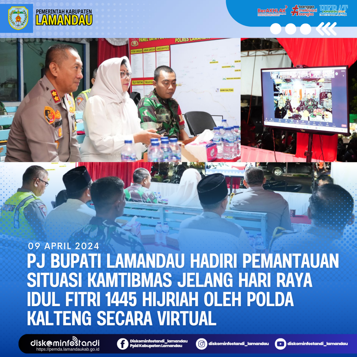 Nanga Bulik – Usai melepas pawai takbir keliling, Penjabat (Pj) Bupati Lamandau, Lilis Suriani bersama Forkopimda dan Sekretaris Daerah menghadiri kegiatan pemantauan situasi Kamtibmas malam Hari Raya Idul Fitri 1445 Hijriah oleh Jajaran Polda Kalteng secara virtual melalui Zoom, Selasa (9/4/2024) digelar di Pos Batu Batanggui Nanga Bulik.