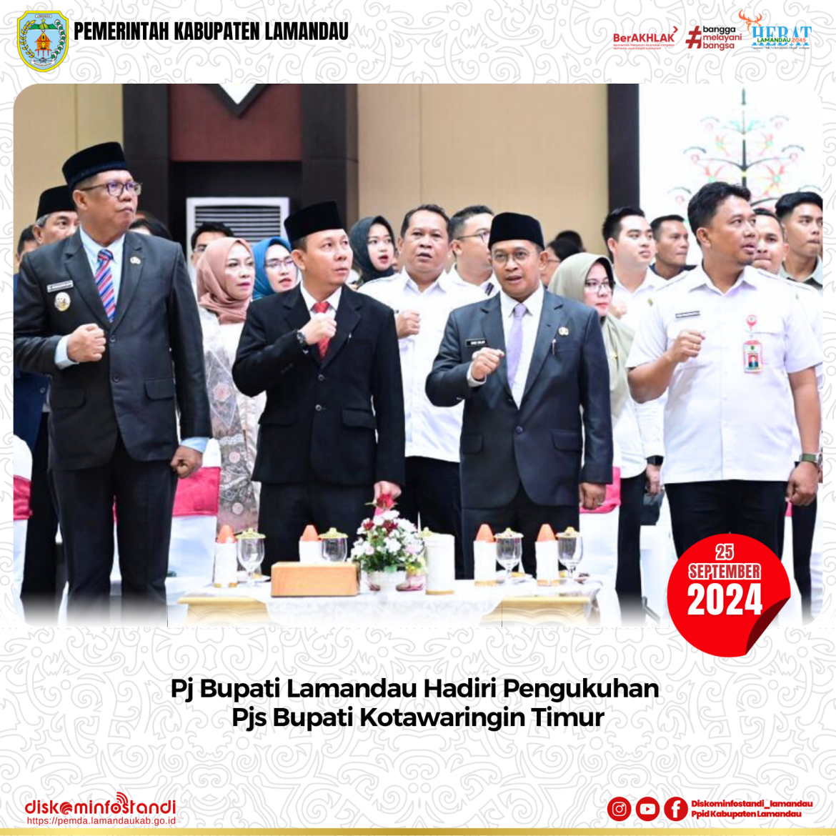 Palangka Raya – Penjabat (Pj) Bupati Lamandau, Said Salim menghadiri pengukuhan Penjabat Sementara (Pjs) Bupati Kotawaringin Timur (Kotim), Shalahuddin, Rabu (25/9/2024) yang diselenggarakan di Aula Jayang Tingang Kantor Gubernur Kalimantang Tengah (Kalteng).