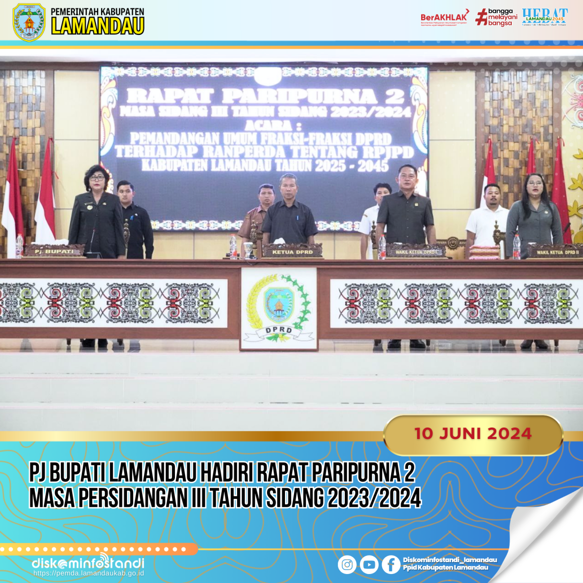 Nanga Bulik – Pj Bupati Lamandau Lilis Suriani menghadiri Rapat Paripurna 2 masa persidangan III tahun sidang 2023/2024 DPRD Kabupaten Lamandau di Ruang Sidang DPRD Kabupaten Lamandau, Senin (10/6).